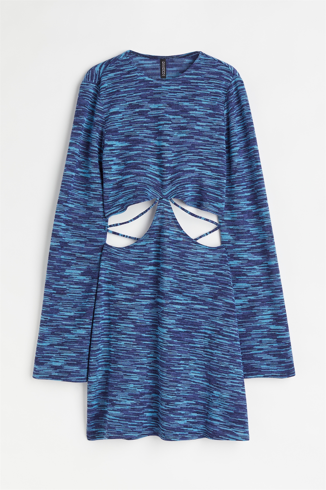 Короткое платье из мягкого тонкого трикотажа с открытыми разрезами и завязками на талии, а также длинными рукавами.