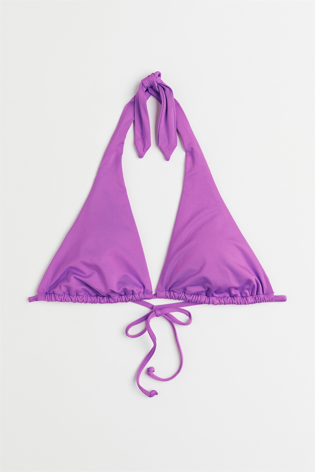 Бикини-треугольник без подкладки, который можно носить по-разному. Завязки сзади и на шее и чашечки со съемными вставками, которые формируют и поддерживают бюст.