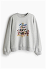 Топ из толстовочной ткани с мотивом спереди. Круглый вырез в рубчик, длинные рукава реглан, манжеты и подол в рубчик.