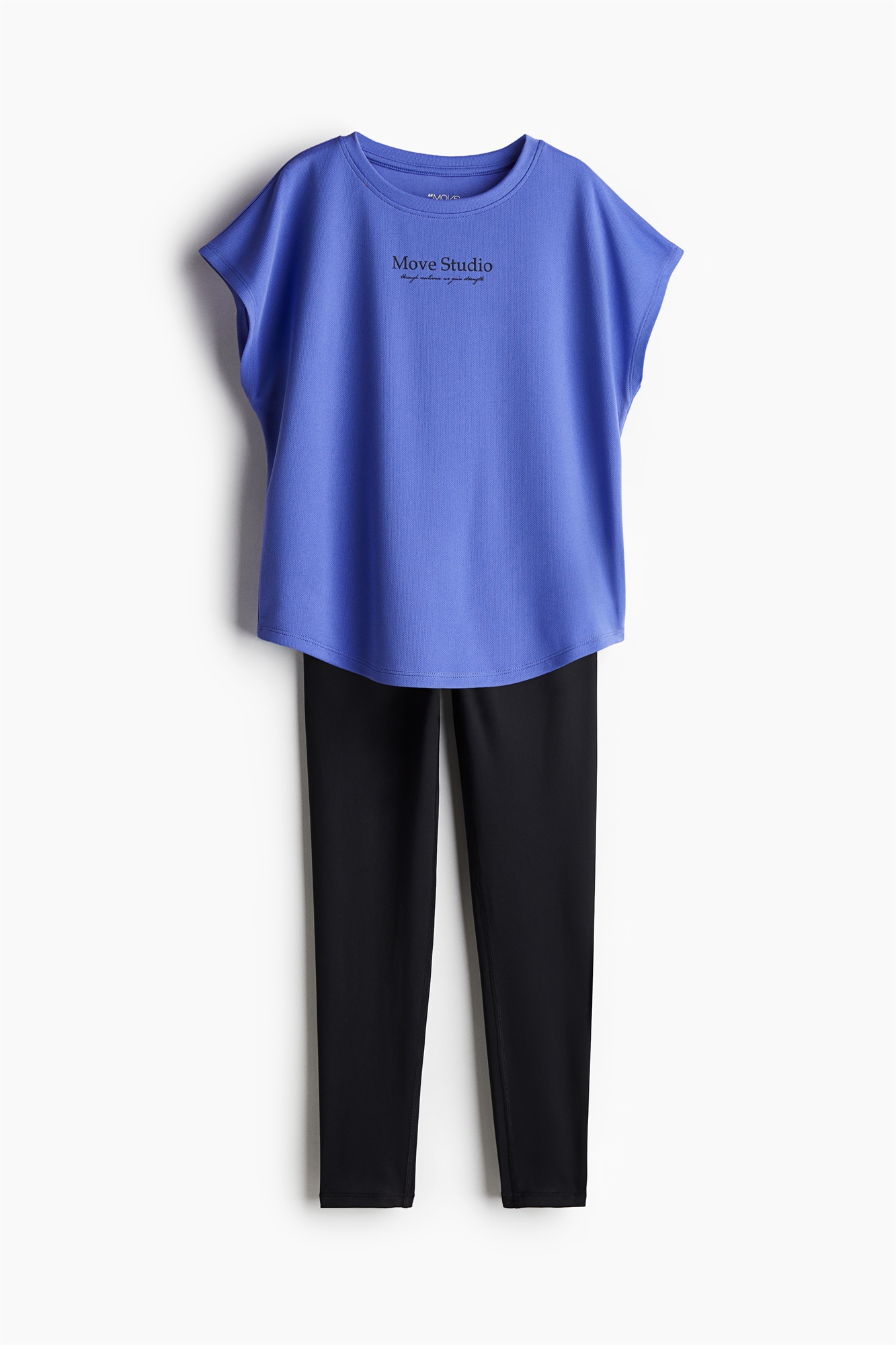 Спортивный комплект из топа и леггинсов из функциональной ткани DryMove™, которая отводит влагу от кожи, обеспечивая комфортную сухость во время движения. Топ с рукавами-капельками, круглым вырезом и закругленным подолом. Слегка удлиненный сзади. Леггинсы с широким поясом.