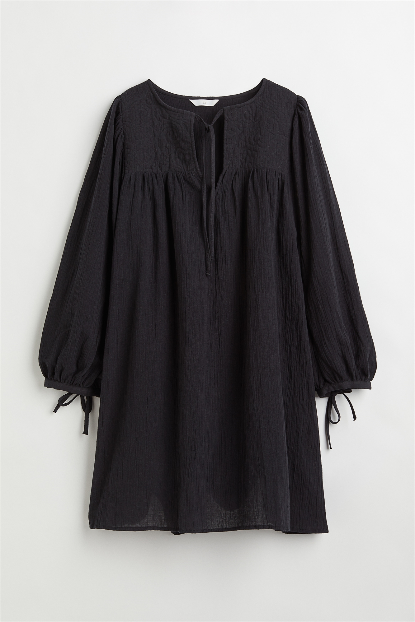 Короткое платье непринужденного кроя из воздушной смеси льна и хлопка. Платье имеет контрастный, прошитый сверху ярмо с V-образной проймой и узкими завязками спереди, а также двухслойное ярмо сзади. Длинные рукава-баллоны с разрезом и узкими манжетами-завязками на концах. Без подкладки.