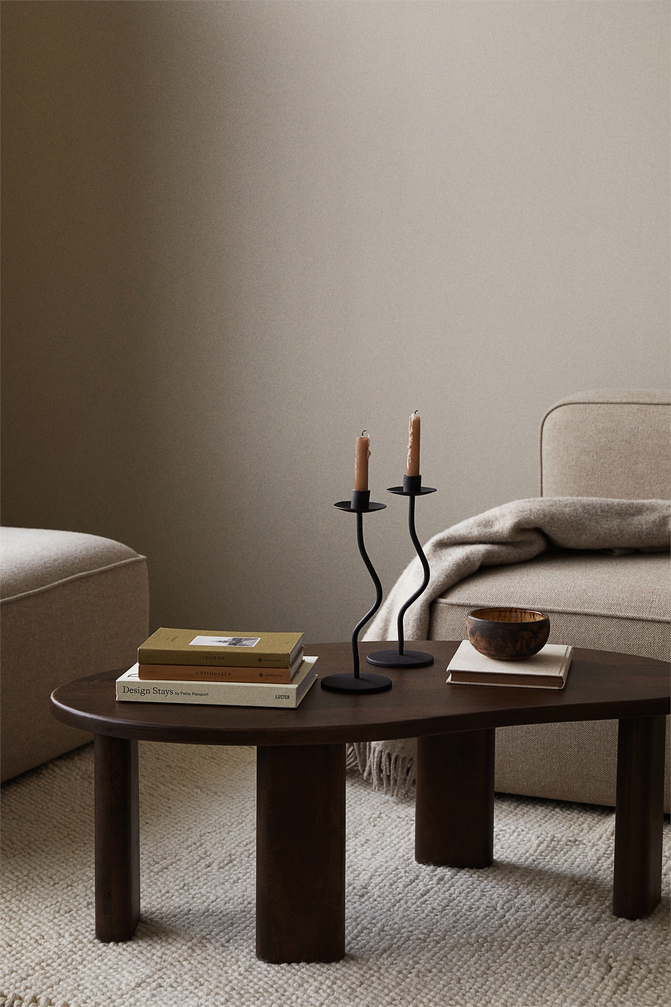 Асимметричный, прочный кофейный столик. Высота 34,8 см. Ширина 54,8 см. Длина 98,1 см.