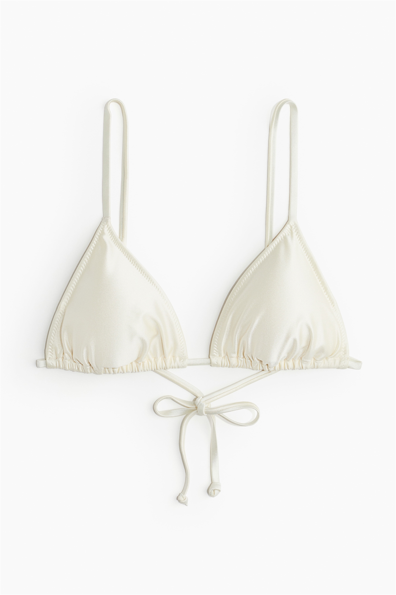 Непромокаемый бикини-треугольник на подкладке с узкими регулируемыми бретелями и завязками сзади. Чашечки с легкой набивкой и съемными вкладышами, которые придают форму бюсту и обеспечивают хорошую поддержку.