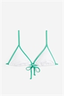 Непромокаемый бикини-треугольник на подкладке с узкими регулируемыми бретелями и завязками сзади. Чашечки с легкой набивкой и съемными вкладышами, которые придают форму бюсту и обеспечивают хорошую поддержку.