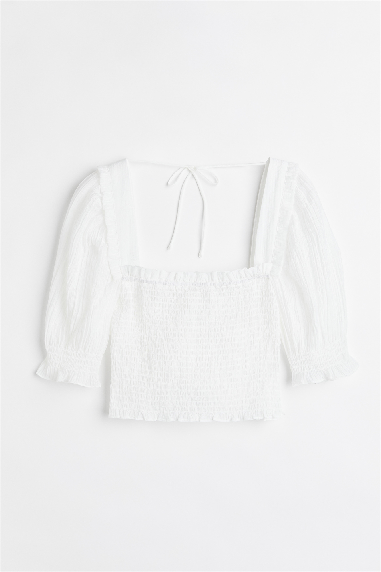 Облегающий топ с квадратным вырезом спереди и сзади и узкими завязками на спине. Лиф с отделкой мокасинами, короткие пышные рукава с отделкой мокасинами и оборками, а также отделка оборками по вырезу горловины и подолу.
