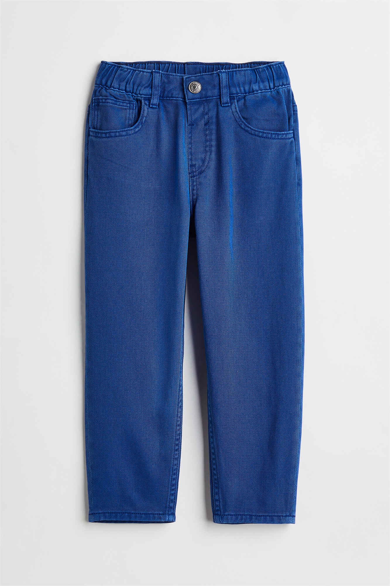 Брюки с 5 карманами из хлопковой саржи, свободный крой и широкие штанины в форме шара с узким подолом. Эластичный пояс с регулируемым эластичным шнурком и ширинкой на пуговицах.