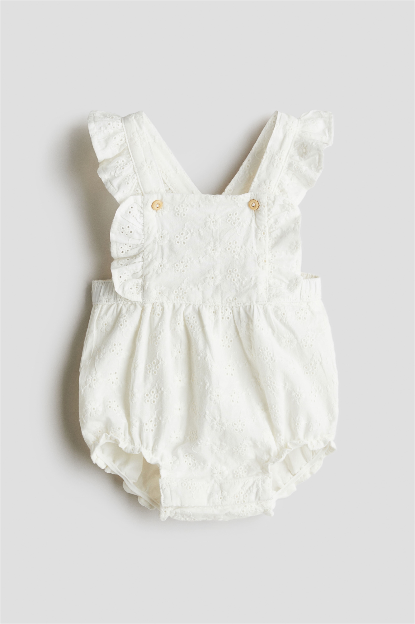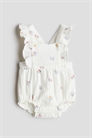 Шорты-нагрудник из хлопковой ткани. Модель с воланом на бретелях, пуговицами в верхней части и эластичным поясом посередине. Шпильки в промежности и эластичные проймы для ног. На подкладке.