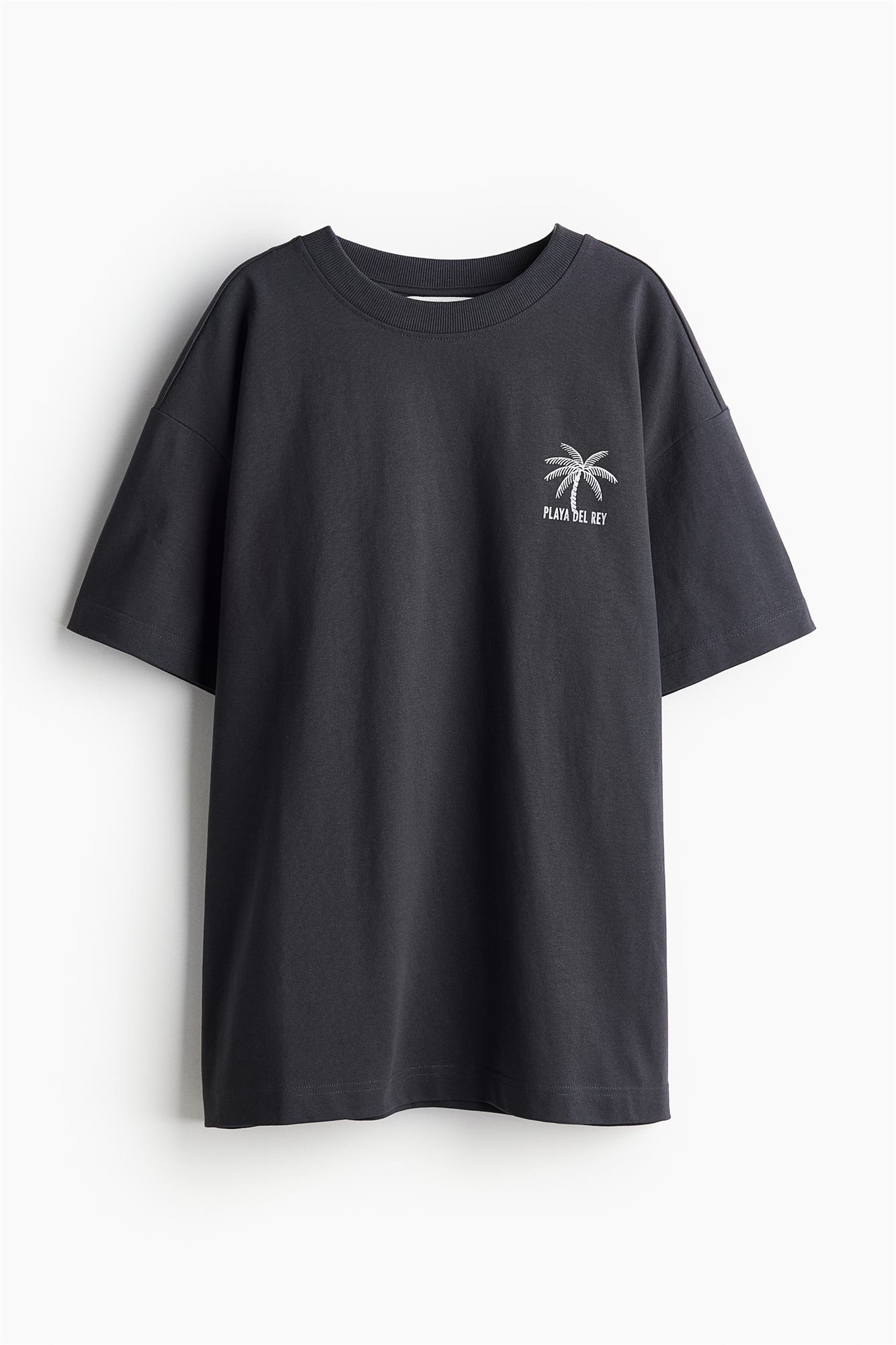 Футболка оверсайз из мягкого хлопкового джерси с круглым вырезом в рубчик, спущенными плечами и прямым кроем подола.