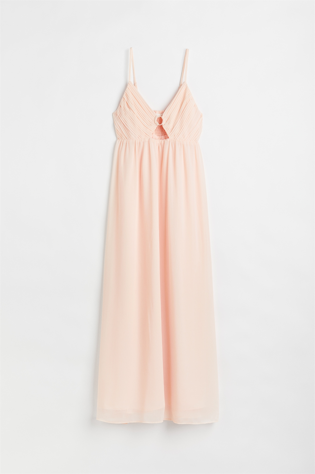 Платье длиной до колен из воздушного, мягко драпирующегося шифона с V-образным вырезом и узкими регулируемыми бретелями. Плиссированный лиф с вырезом и декоративным кольцом спереди, а также со швом на спине. Атласная подкладка.