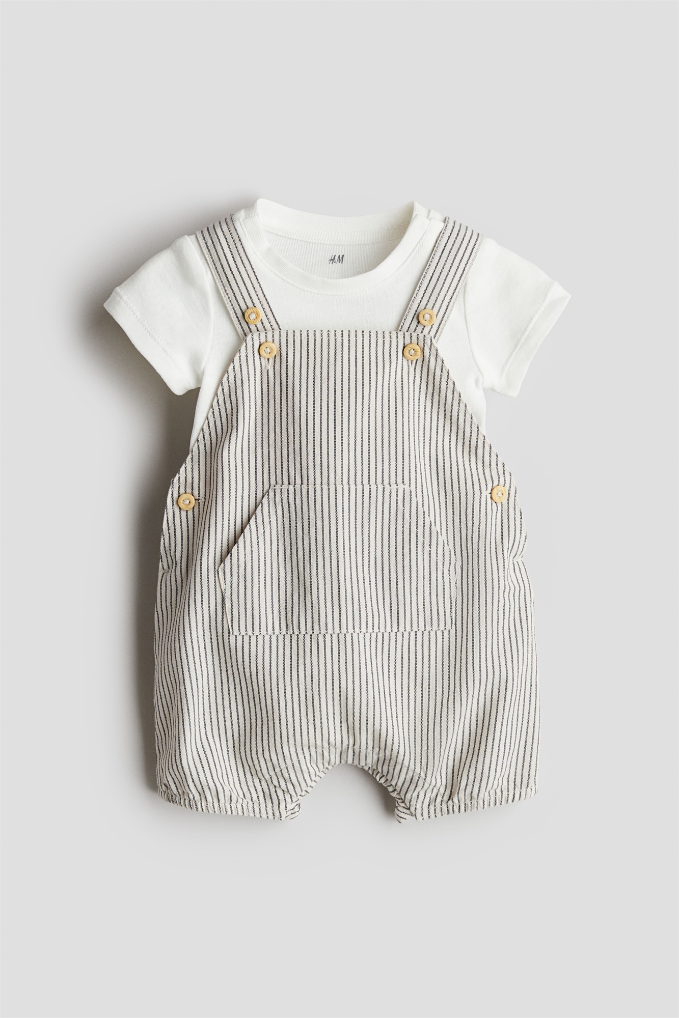 Комплект из боди с короткими рукавами из ребристого хлопкового джерси и полукомбинезона из хлопкового плетения. Боди с застежками на плечах и в промежности. Полукомбинезон с перекрещивающимися сзади бретелями и регулируемыми пуговицами. Эластичная резинка на талии, кнопки по бокам и карман-кенгуру. Скрытые кнопки в промежности.
