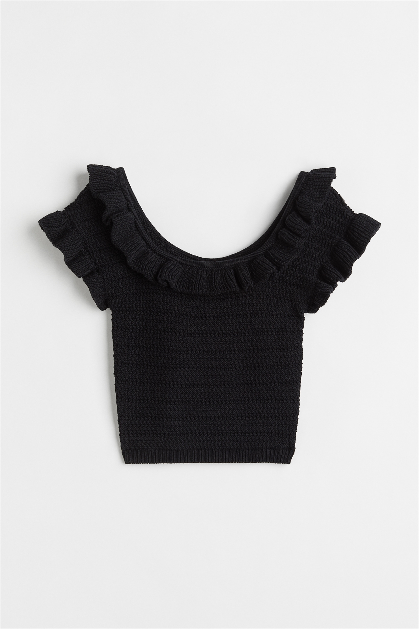 Облегающий топ из вязаного трикотажа. Широкий квадратный вырез с воланами по всему периметру, короткие рукава с воланами и ребристая отделка по подолу.