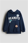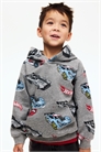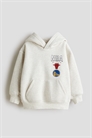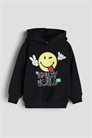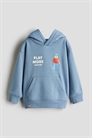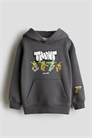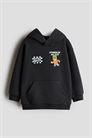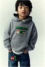 Свободный крой толстовки из принтованной ткани с мягкой начесом внутри. Капюшон на подкладке, накидка спереди, спущенные плечи, длинные рукава, манжеты и подол в рубчик.