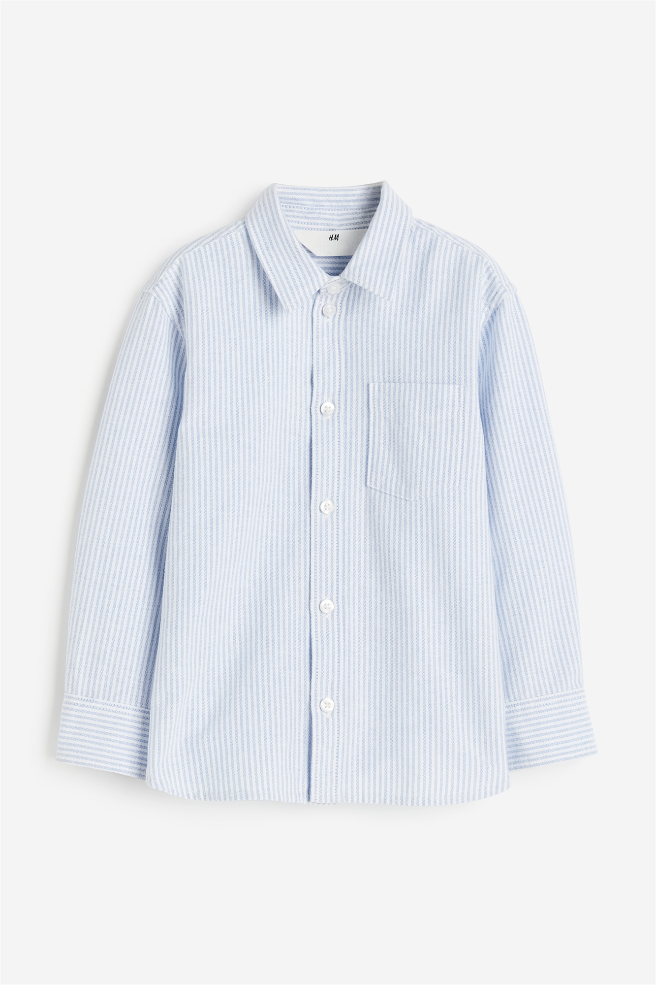 Рубашка из оксфордского хлопка с воротником, пуговицами спереди и ярмом сзади. Открытый нагрудный карман и длинные рукава с рукавной планкой и манжетами на пуговицах. Аккуратный закругленный подол.