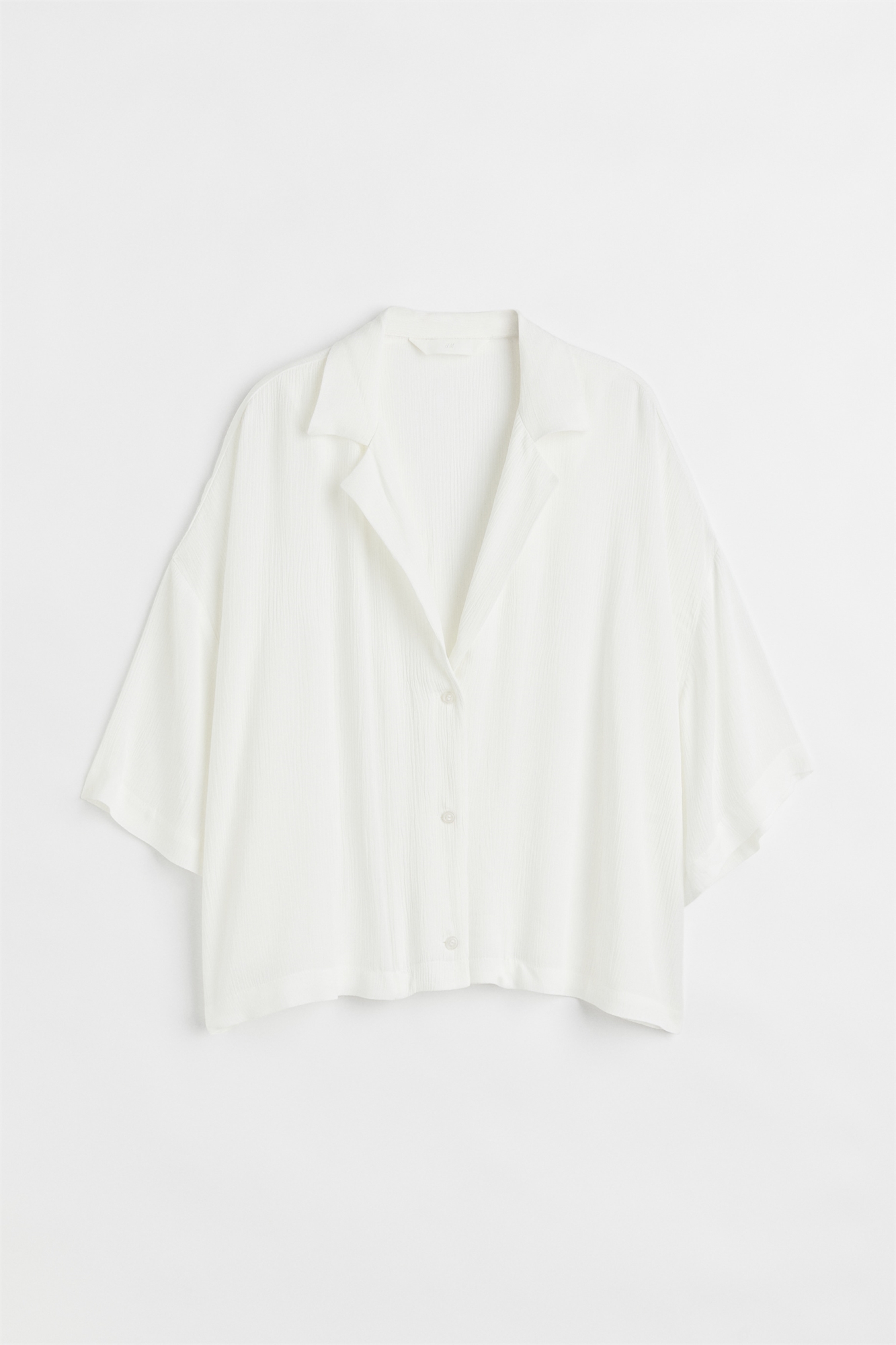 Короткая рубашка больших размеров из мягко драпирующегося вискозного полотна с курортным воротником и пуговицами спереди. Спущенные плечи и короткие широкие рукава, заканчивающиеся на локтях. Без отделки.