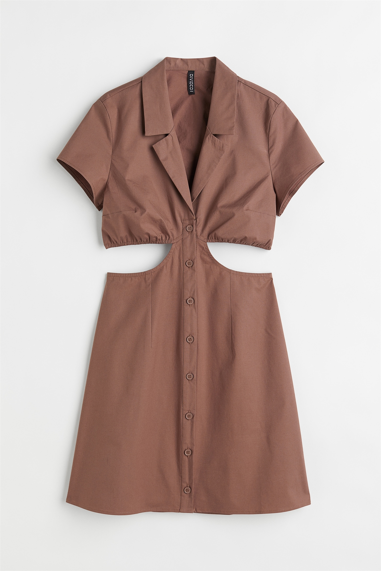 Короткое платье-блузка из слегка жесткого хлопкового поплина. Фасон без спинки с застежкой на пуговицы по всей длине, V-образным вырезом горловины с отложным воротником, короткими рукавами и слегка расклешенной юбкой. Вырезы по бокам с узким закрытым эластичным верхом. Без подкладки.