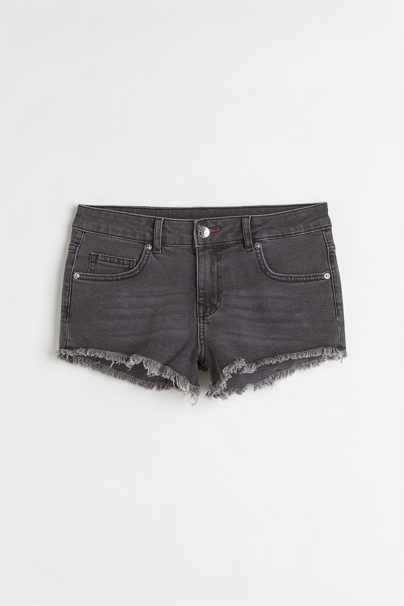 Шорты из слегка эластичного хлопкового денима с низкой талией, застежкой на молнию и пуговицу, боковыми карманами, карманом для монет и отлетными задними карманами с пуговицей. Зауженные ноги с обтрепанными необработанными краями.