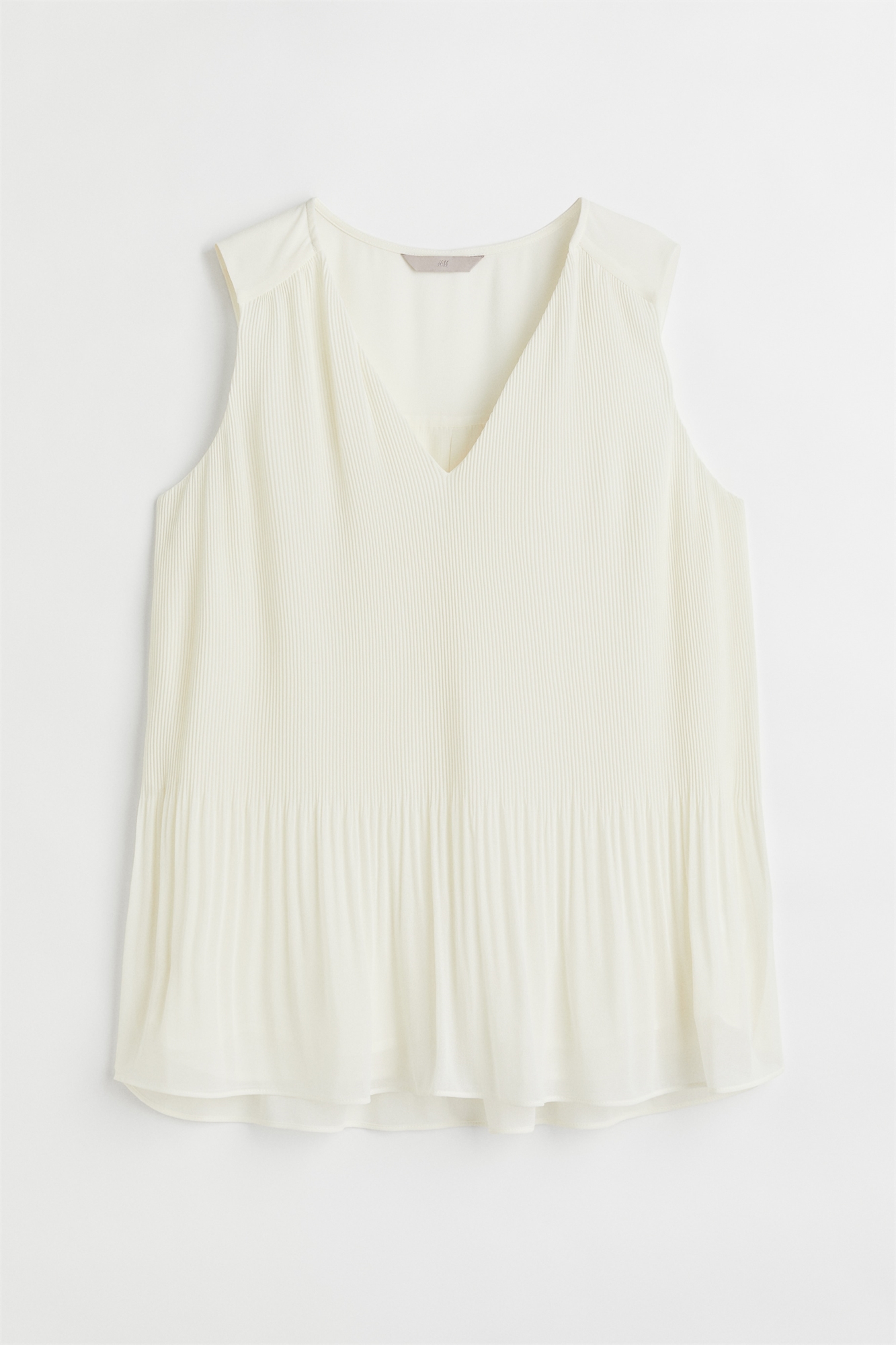 Топ А-линии без рукавов из плиссированного шифона. Свободный крой с V-образным вырезом спереди и двухслойным вырезом сзади. На подкладке.