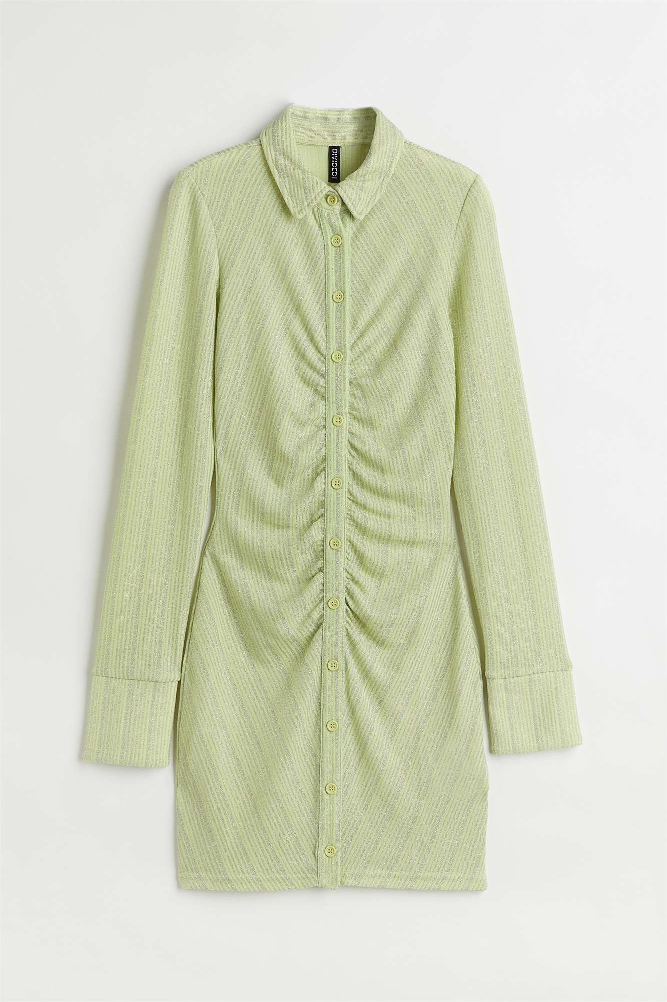 Короткое платье из тканого материала с воротником, застежкой на пуговицы спереди, удлиненными рукавами и широкими манжетами с разрезом. Драпировка по краю пуговиц. Без подкладки.