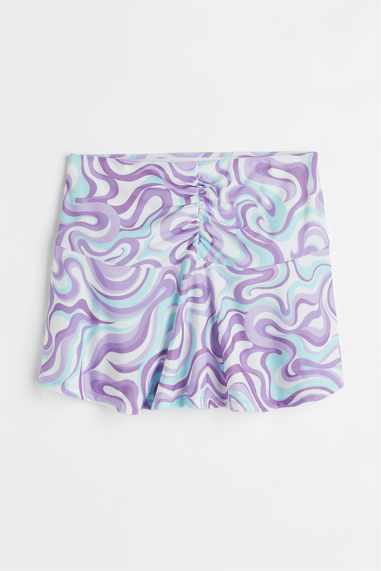 Короткая расклешенная юбка из джерси-стрейч. Заниженная талия со скрытой резинкой и сборчатым швом спереди. Без подкладки.