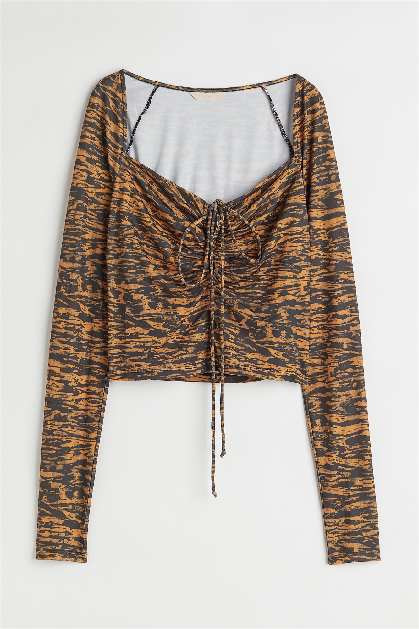 Короткая рубашка из мягкого трикотажа с квадратным вырезом и небольшой проймой с узкими длинными завязками спереди. Длинные рукава.