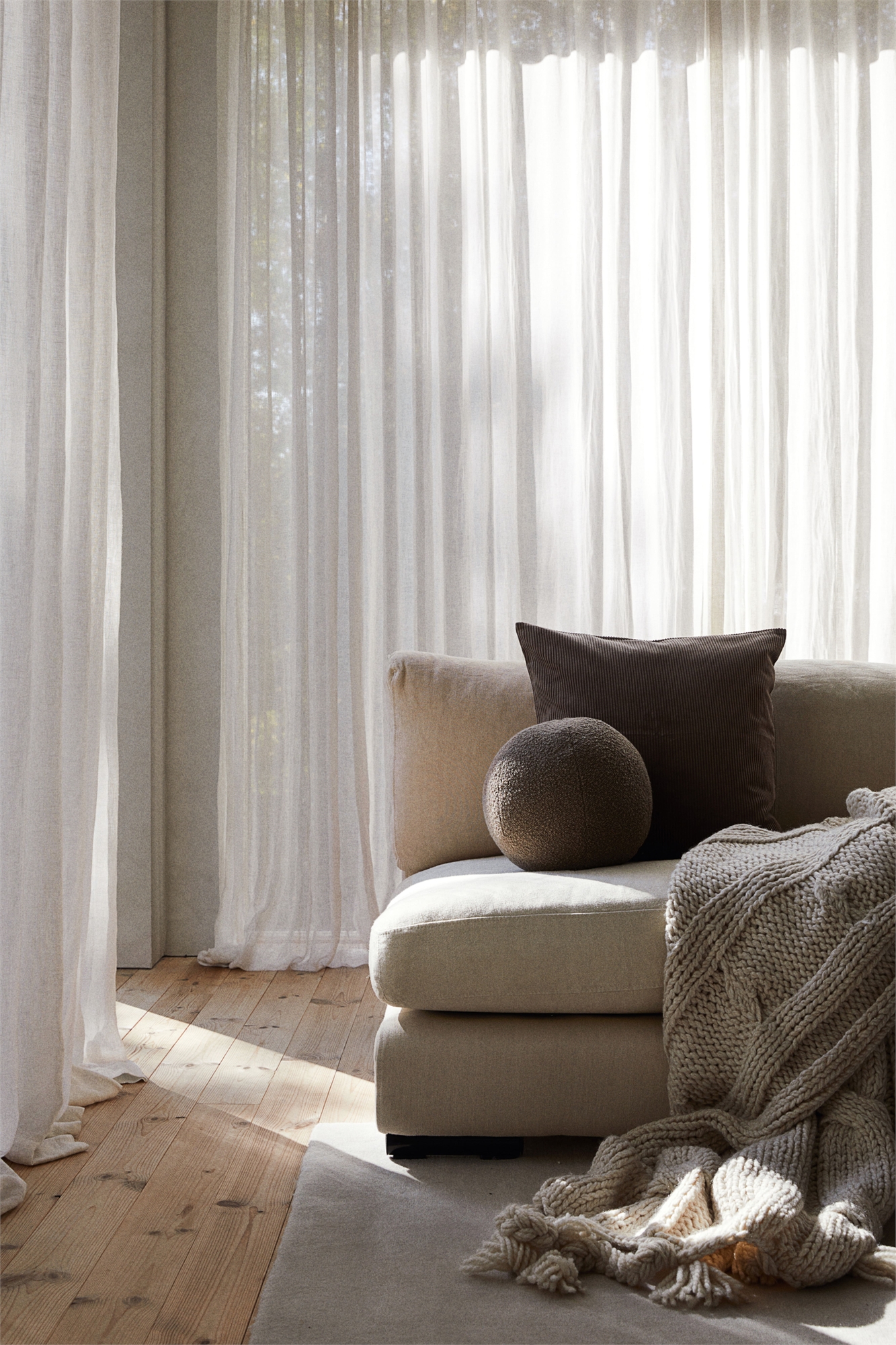 Широкая штора из вуали из смеси льна и хлопка. Многосторонний заголовок для четырех вариантов подвешивания: на карнизе с петлями для штор, на крючках для штор, на крючках для штор с четырьмя когтями или в современном стиле "волна". Крючки в комплект не входят. С подолом.