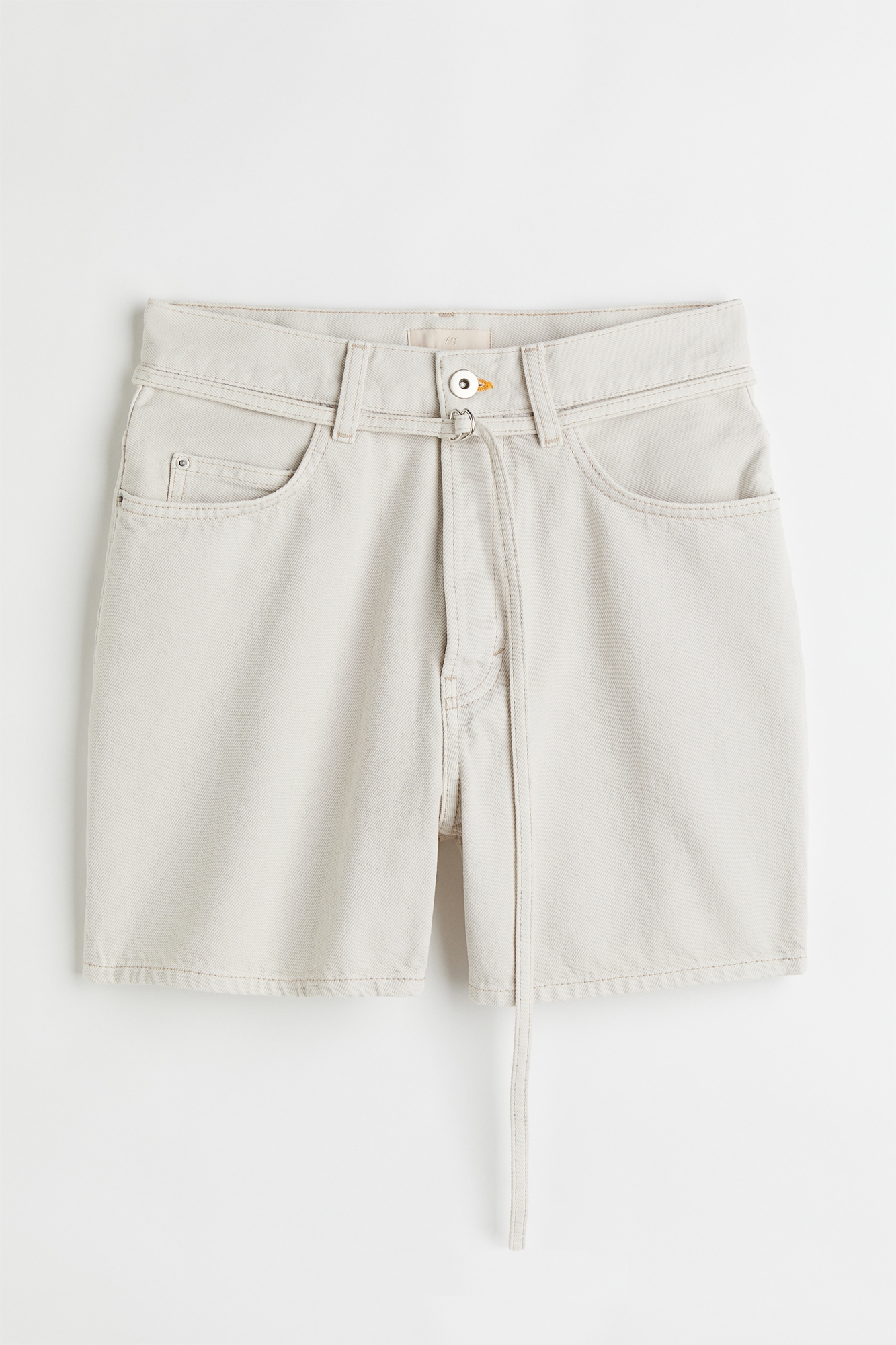 Шорты с 5 карманами из хлопкового денима. Регулярный крой с высокой талией, узкий тканевый пояс с металлическими кольцами D и ширинка на пуговице.