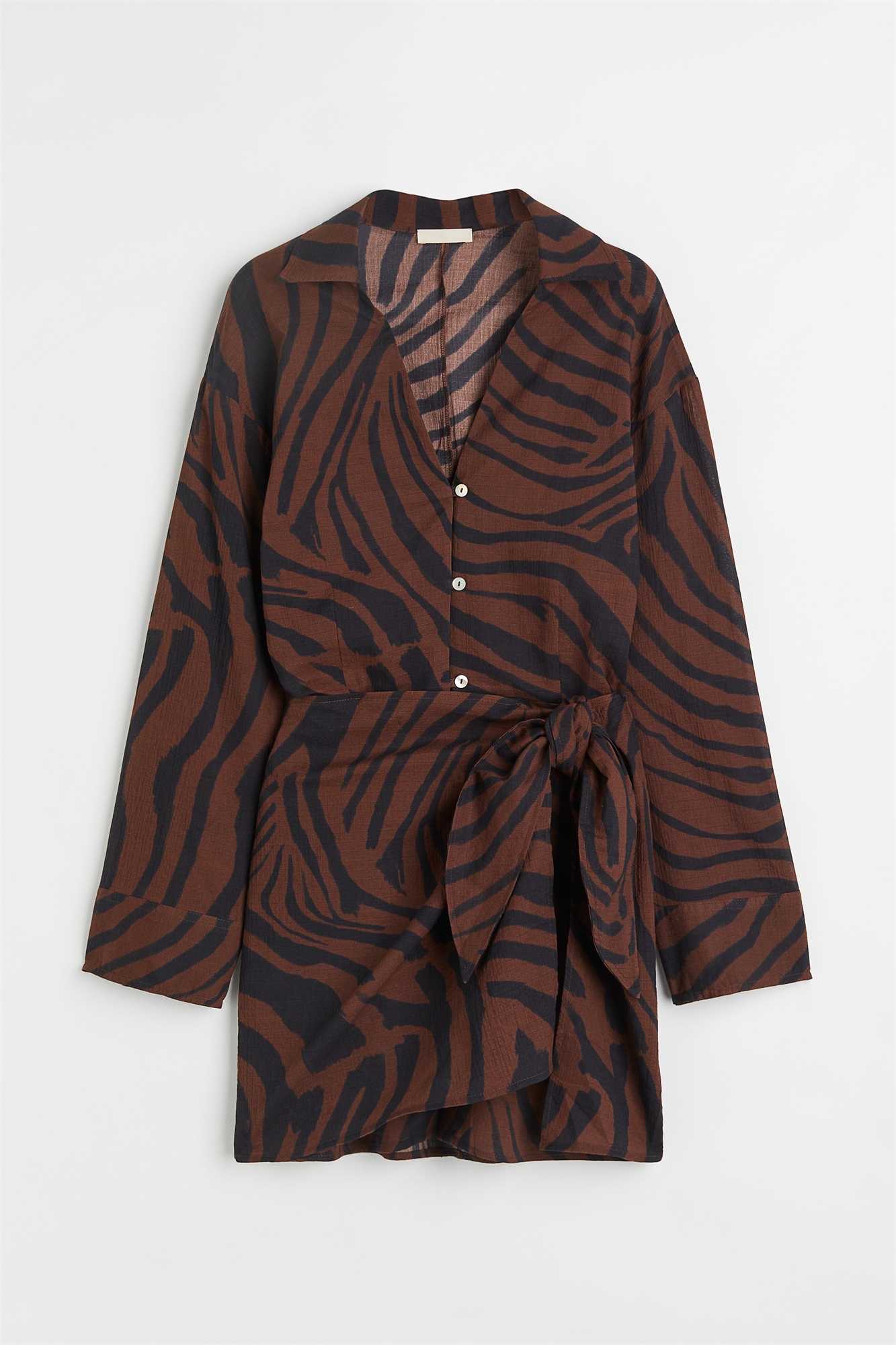 Короткое платье из тканого материала с воротником, V-образным вырезом и едва заметными мерцающими перламутровыми пуговицами спереди. Платье имеет слегка спущенные плечи, длинные рукава прямого кроя и широкие манжеты с разрезом и пуговицей. Разделительный шов на талии и юбка в обтяжку с завязками с одной стороны. Без подкладки.