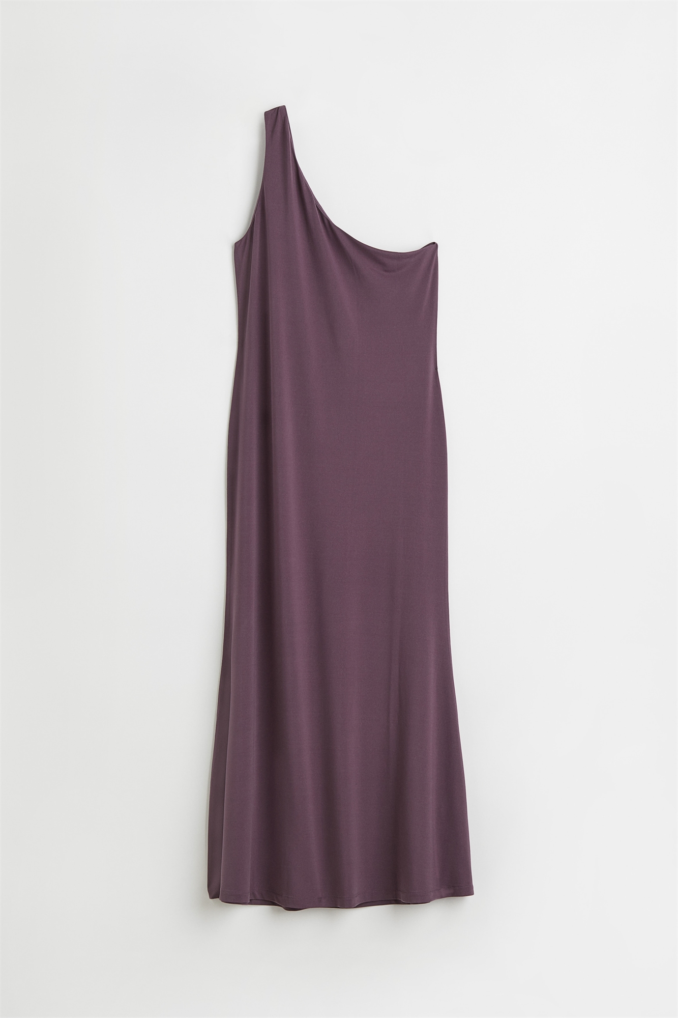 Платье длиной до колена, на одно плечо, из джерси. Узкий крой в верхней части с широким ремешком и расклешенной юбкой.