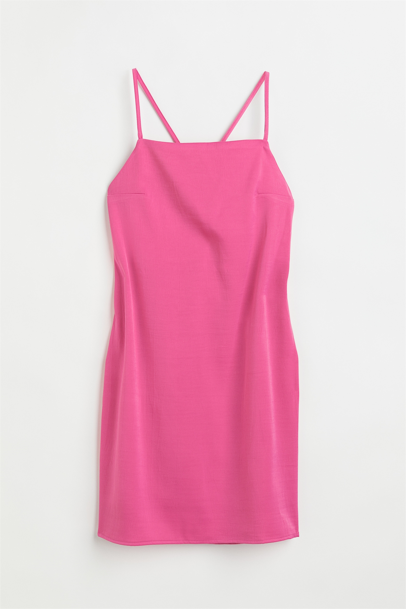 Короткое платье из мягко драпирующегося атласа с открытой спиной и бретелями-спагетти, перекрещивающимися сзади. Без подкладки.