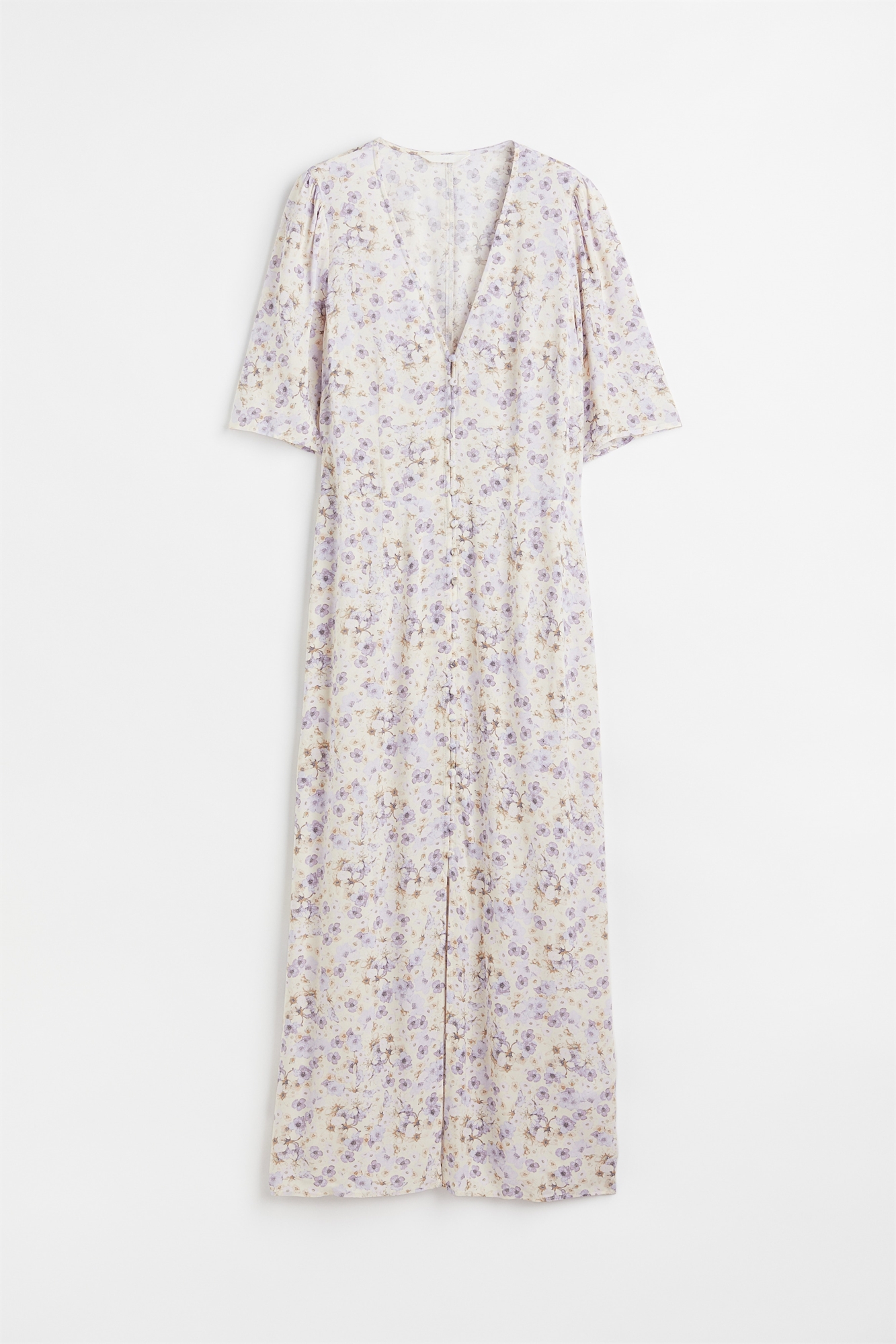 Облегающее платье длиной до колен из вискозной ткани. Платье имеет V-образный вырез, застежку на пуговицы спереди и короткие рукава, собранные вверху. Разделительный шов на талии. Мягкая, струящаяся юбка. Без подкладки.