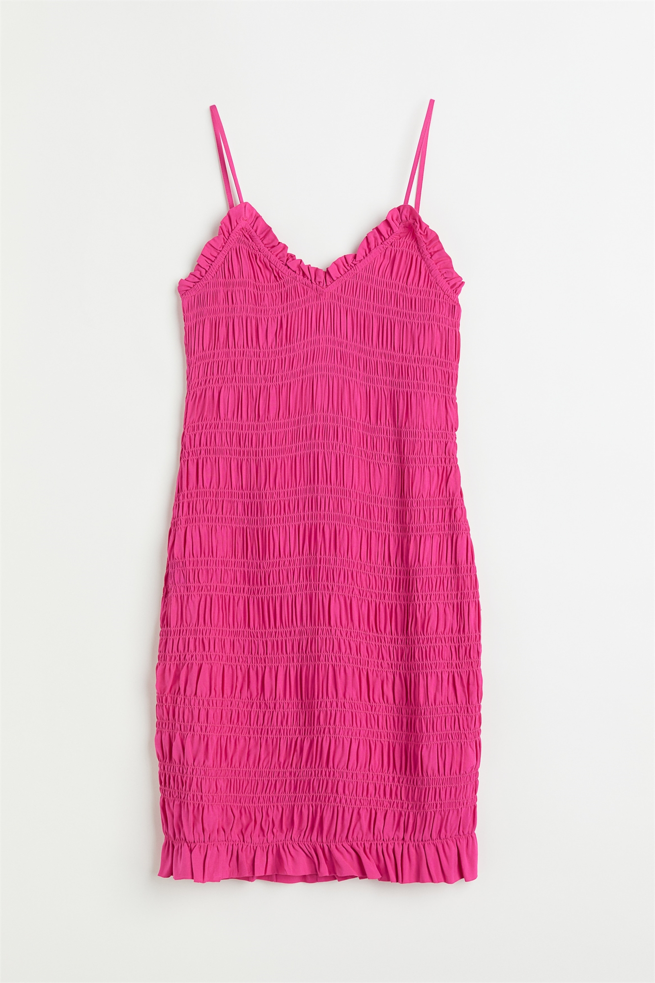 Короткое платье из вискозной ткани с V-образным вырезом и узкими регулируемыми бретелями. Облегающий фасон с воланами по вырезу и подолу. Без подкладки.