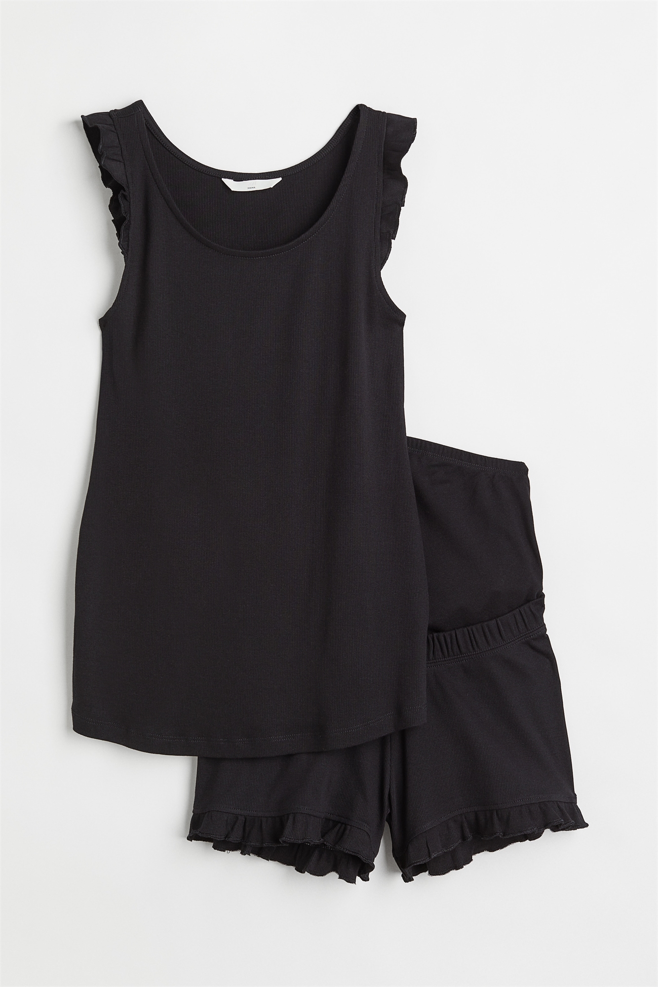 Комплект из майки и шорт из ребристого хлопкового джерси. Майка с узким воланом на плечах. Шорты с небольшим воланом на концах ног и широким поясом для идеальной посадки на животике.