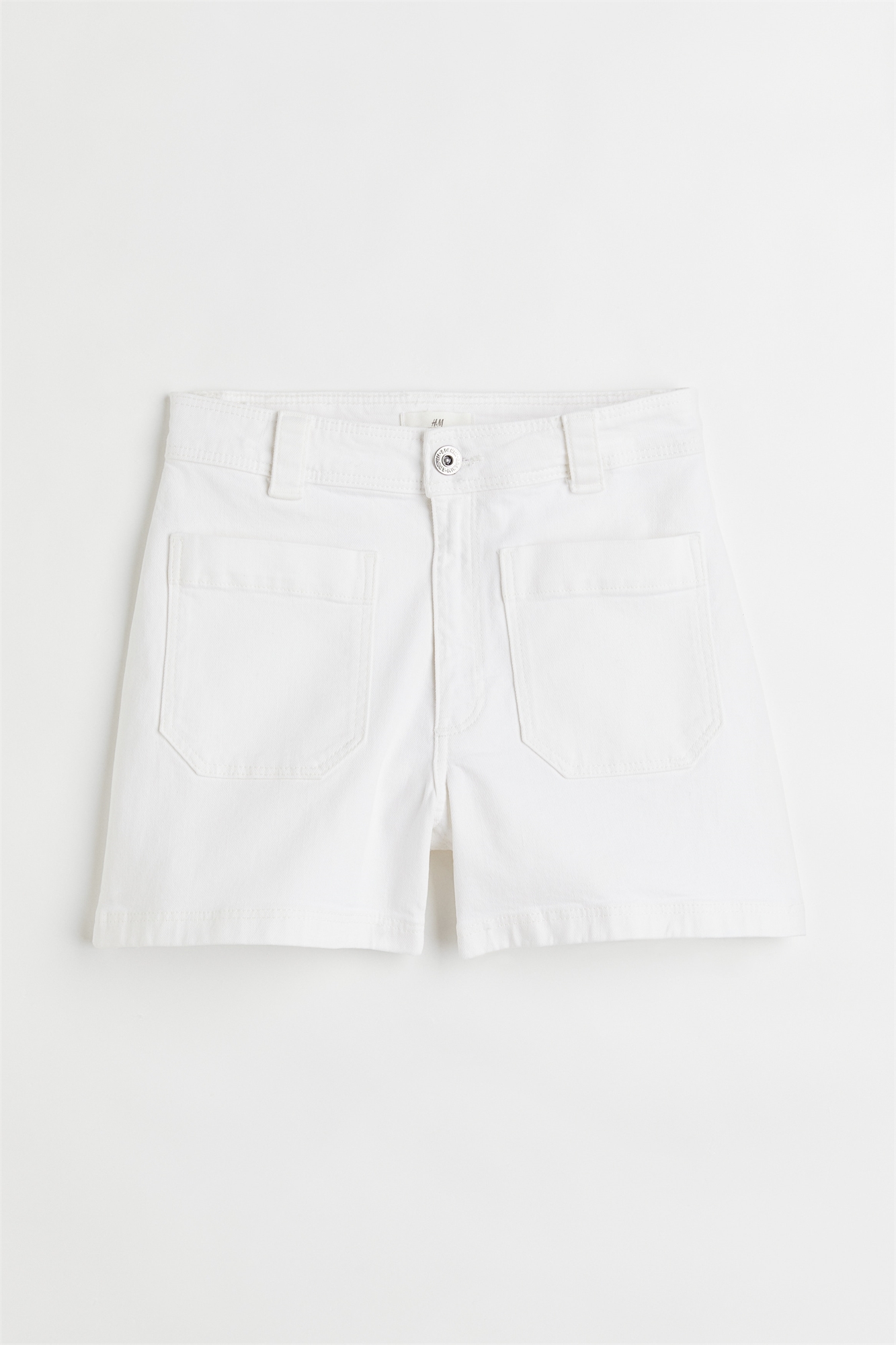Шорты из слегка эластичного хлопкового денима с зауженной талией, ширинкой на молнии, пуговицей и накладными передними карманами.