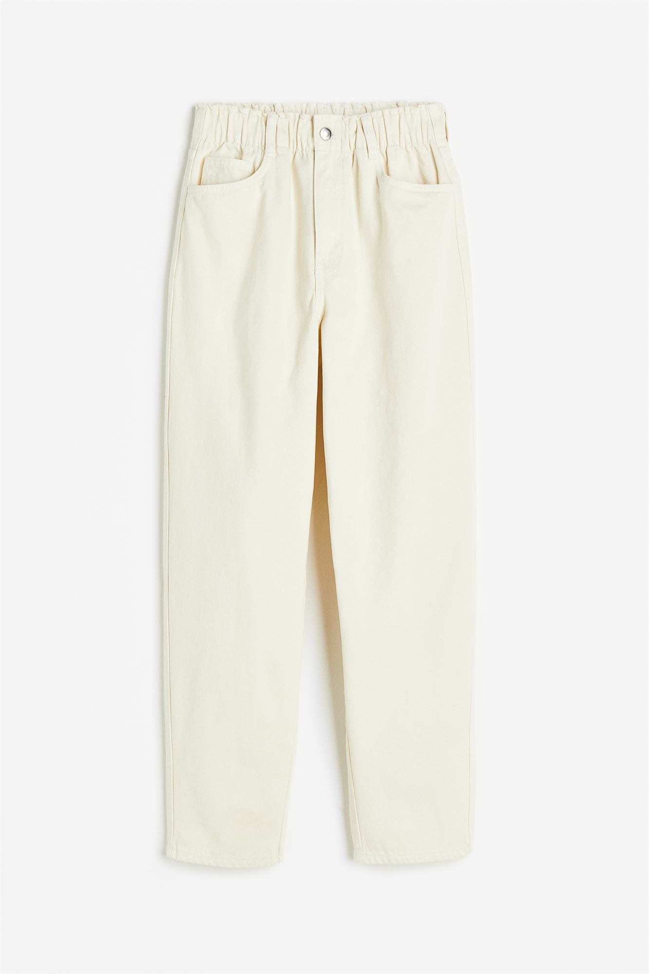Брюки с 5 карманами и длиной до щиколотки из хлопковой саржи. Высокая талия с эластичной отделкой и небольшой оборкой, ширинка на молнии и пуговице, широкие, слегка сужающиеся к низу ноги.