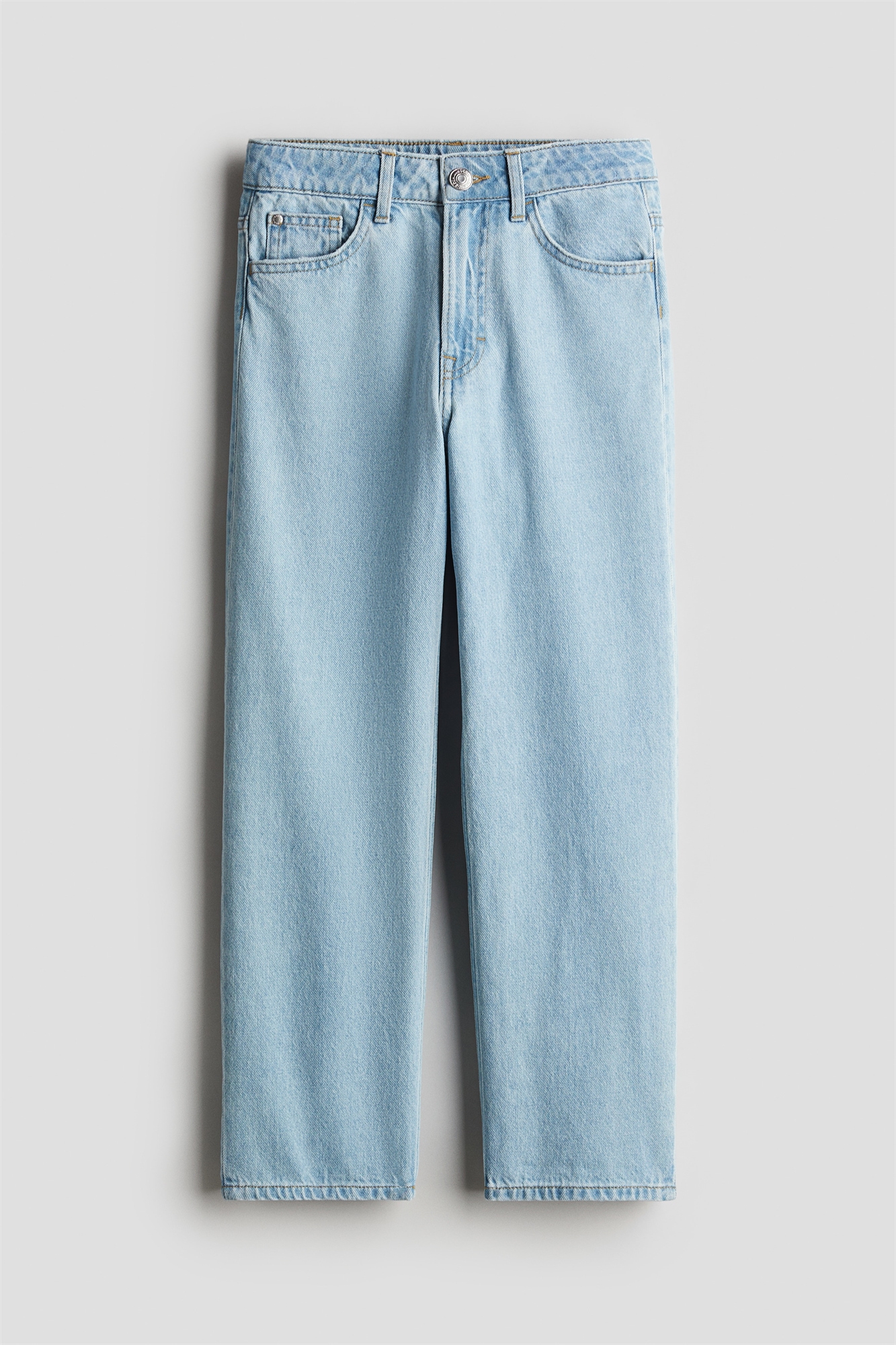 Джинсы с 5 карманами и свободным кроем из моющегося хлопкового денима. Регулируемая резинка на талии, ширинка на молнии и пуговице, прямые ноги.