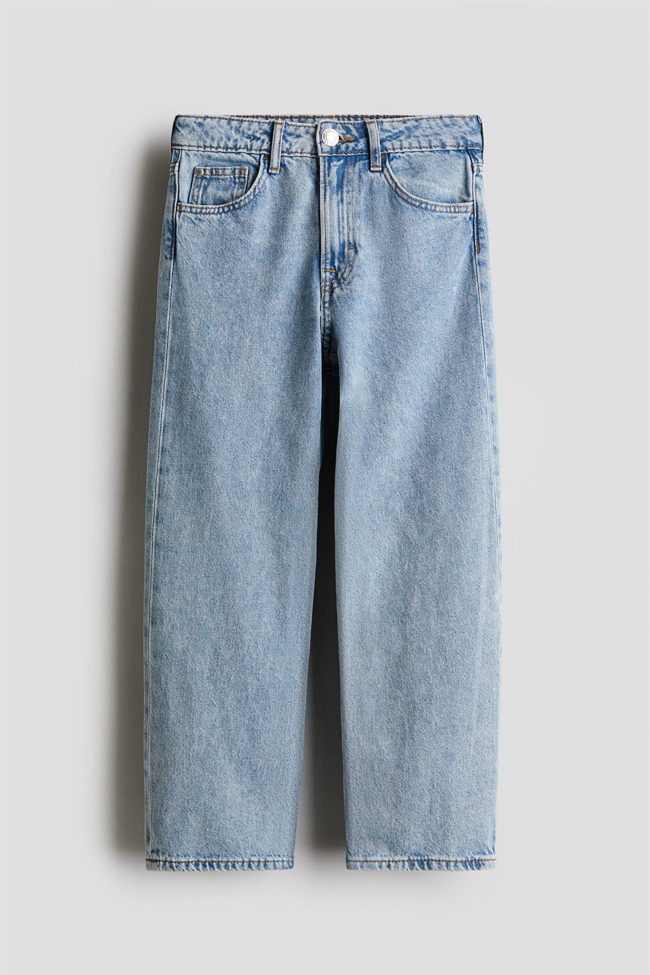 Джинсы с 5 карманами и свободным кроем из моющегося хлопкового денима. Регулируемая резинка на талии, ширинка на молнии и пуговице, прямые ноги.