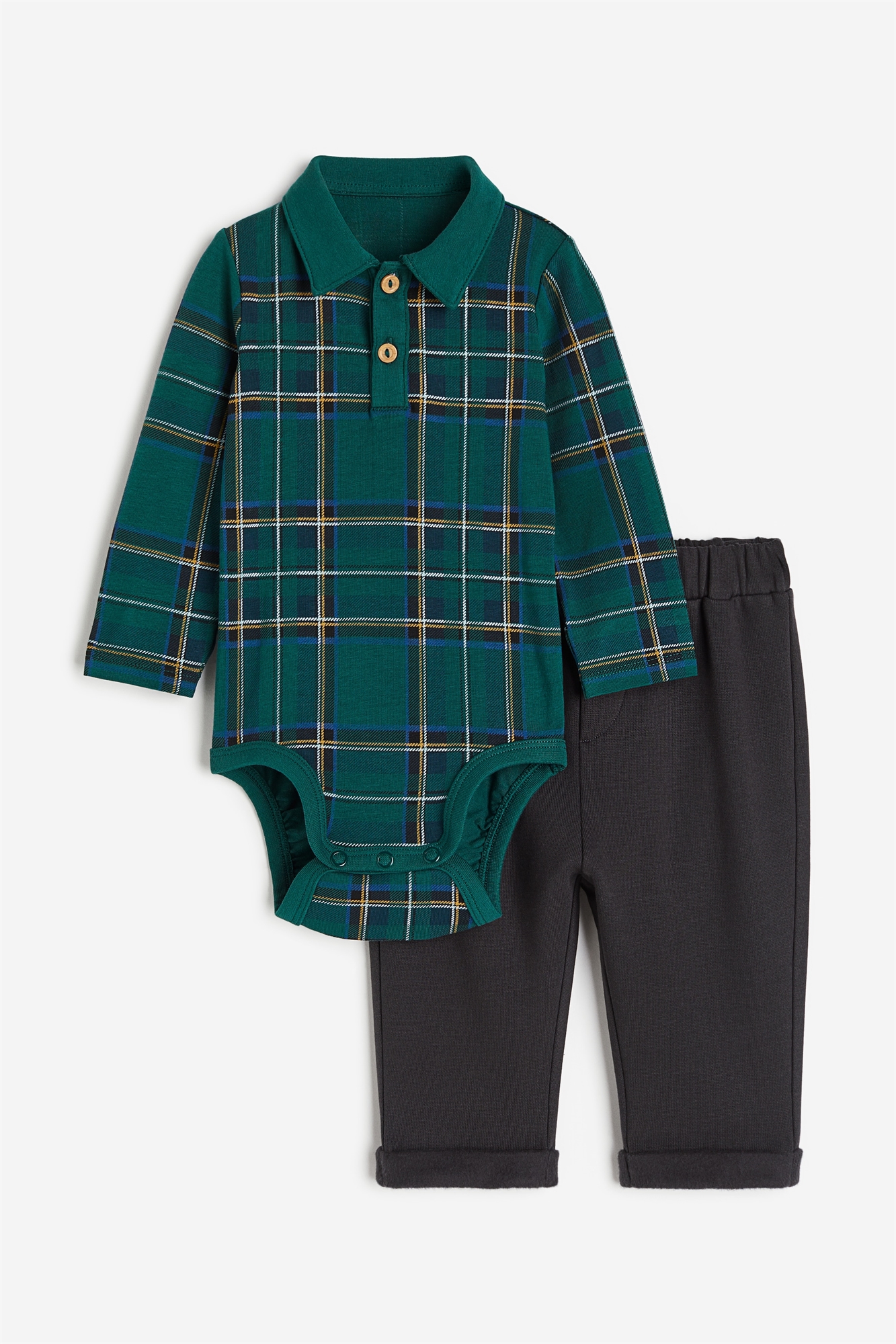 Комплект из боди из вафельного хлопкового джерси и брюк из толстовки с мягкой начесом внутри. Боди с длинными рукавами, воротничком и кнопками в верхней части, кнопками в промежности и тесемками вокруг ножек для плотного прилегания к подгузнику. Брюки с регулируемой эластичной резинкой на талии, фальшивой ширинкой и вшитыми оборочками на подоле.