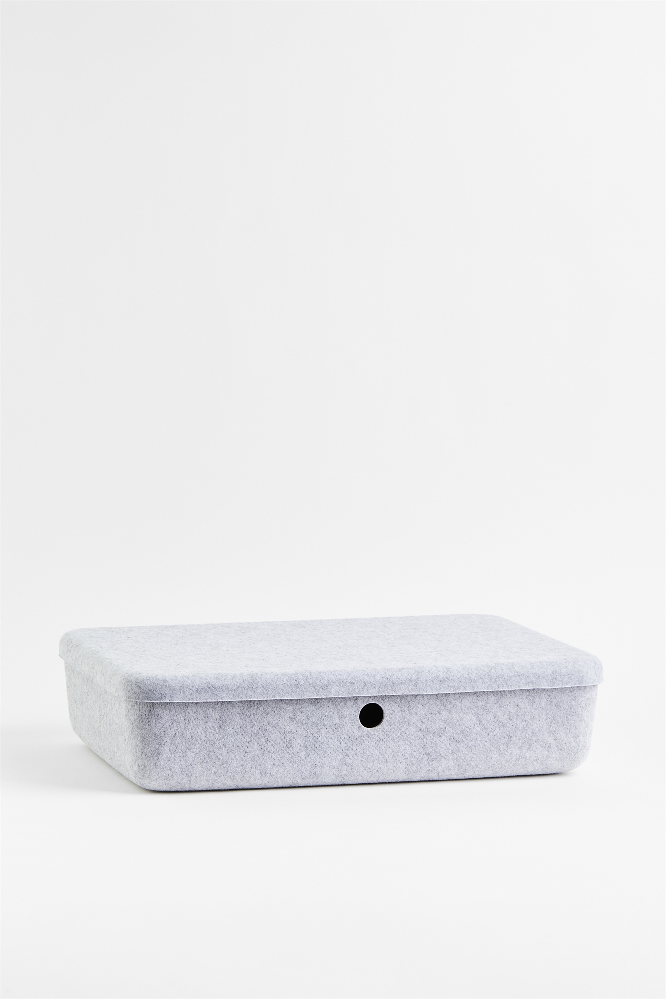 Войлочная коробка для хранения с крышкой для удобной организации. Отверстия в двух боковых стенках облегчают переноску. Высота 15 см. Ширина 37 см. Длина 57 см.