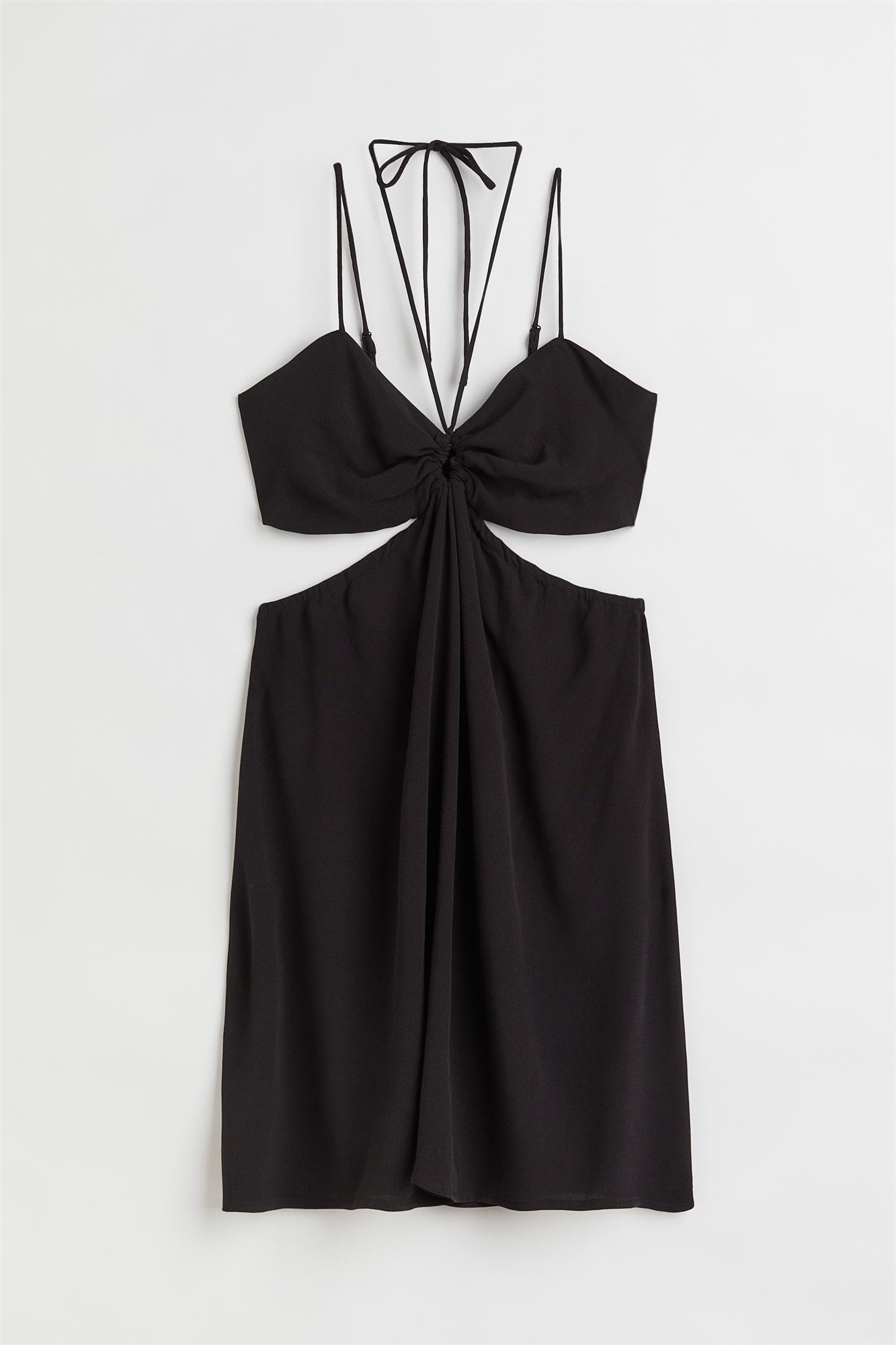 Короткое платье из вискозы с V-образным вырезом и узкими регулируемыми бретелями. Верхняя часть спереди имеет открытый разрез с завязками, узкие бретели которого завязываются на затылке. Сзади - вставка из плащёвки. Открытые разрезы по бокам и сзади. Юбка в форме колокола имеет эластичный верх. Без подкладки.