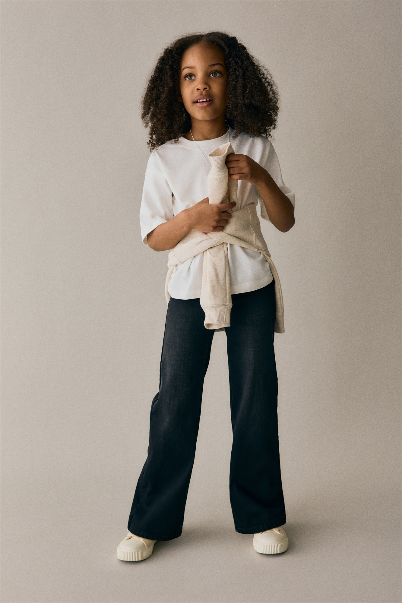 Джинсы из стиранного денима. Свободный крой, эластичная резинка на талии, фальшивая ширинка, фальшивые передние карманы, настоящие задние карманы и широкие штанины.