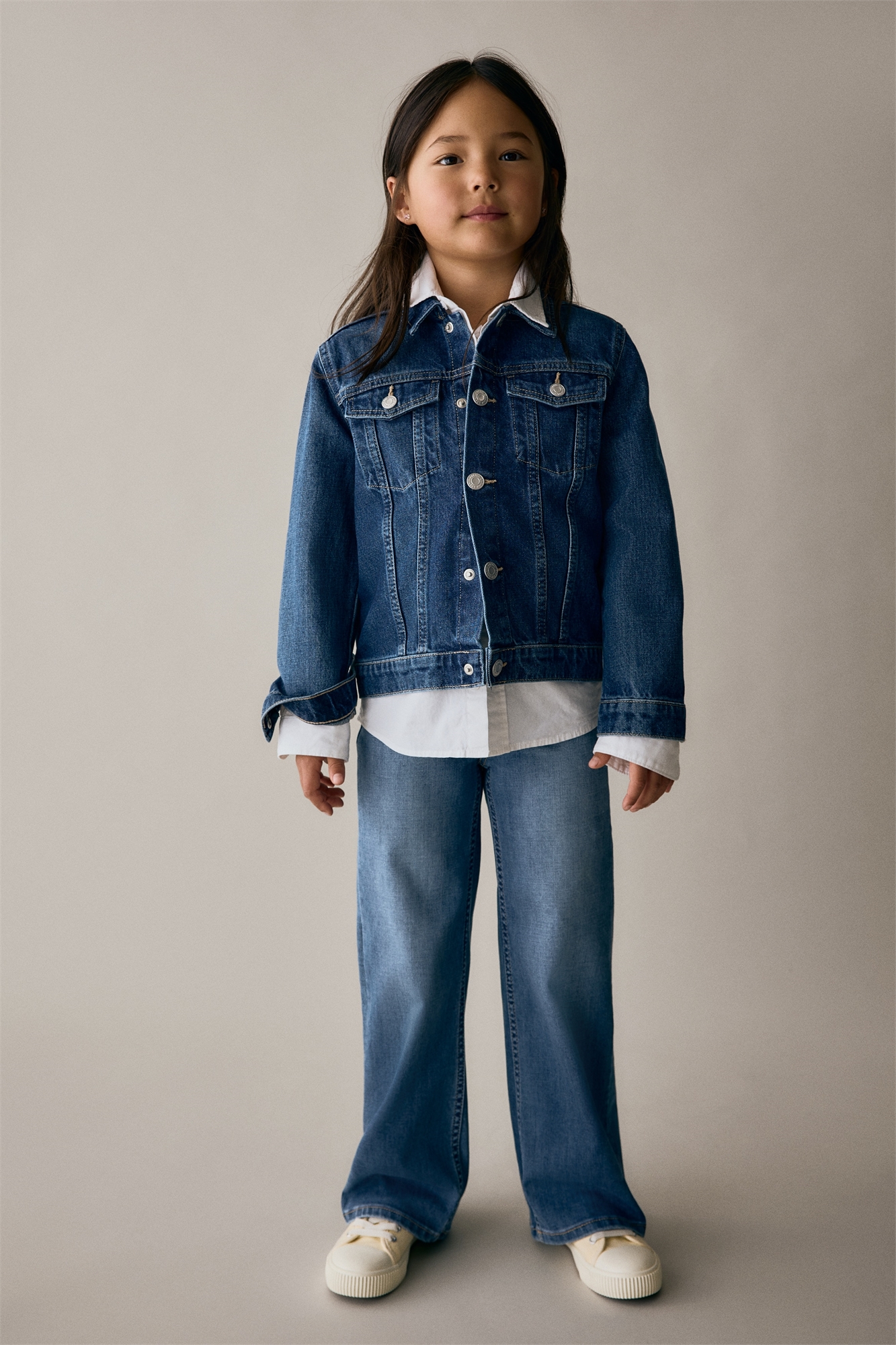 Джинсы из стиранного денима. Свободный крой, эластичная резинка на талии, фальшивая ширинка, фальшивые передние карманы, настоящие задние карманы и широкие штанины.