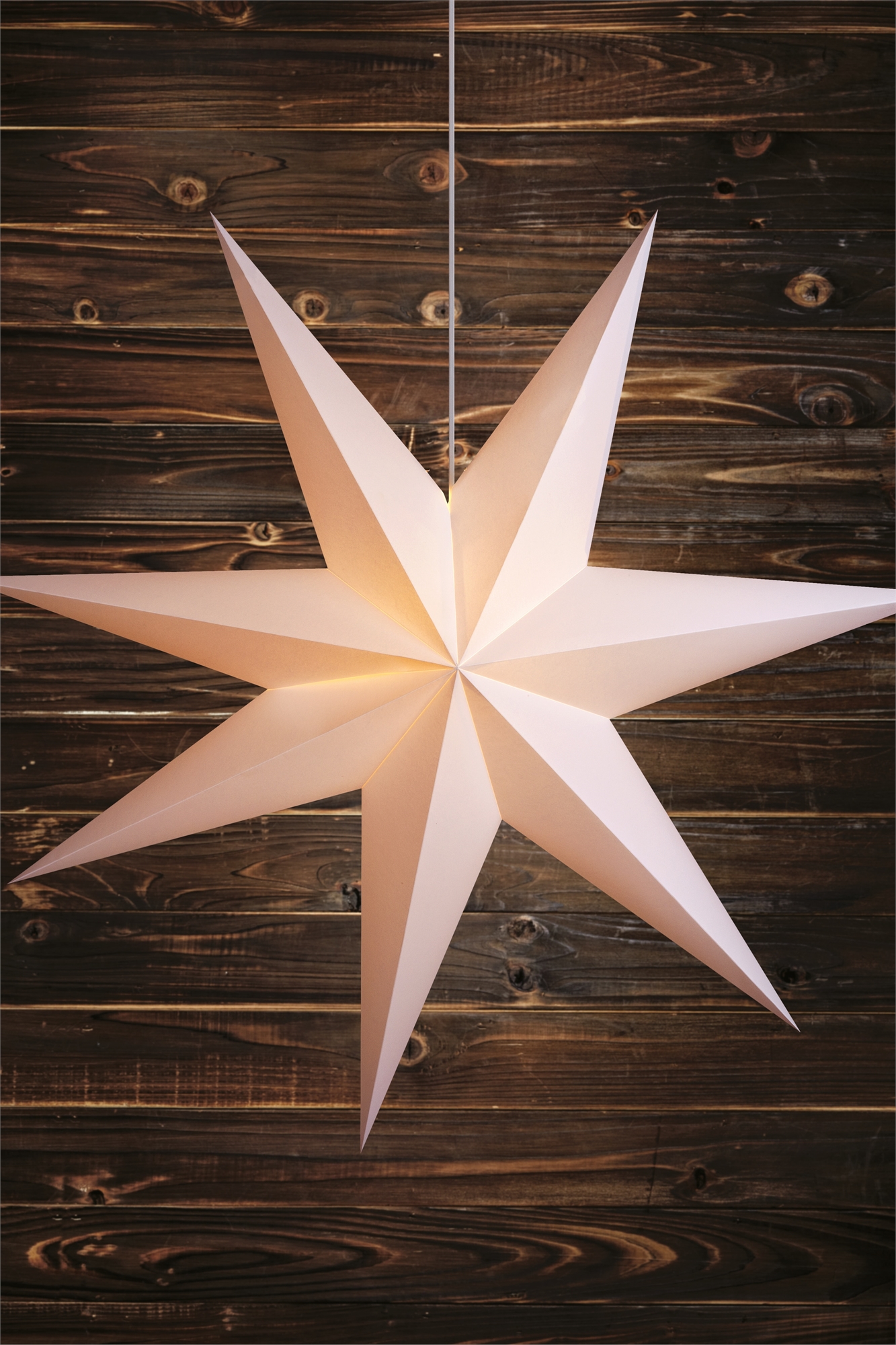Простая, но стильная звезда из белого картона для окна. Для звезды требуется лампочка с маленьким цоколем (E14) мощностью не более 25 Вт или эквивалентная светодиодная лампа, в комплект не входит. Кабель длиной 3,5 м с выключателем в комплекте. Размер лампы: 100 см в ширину, 28 см в глубину, 100 см в высоту.