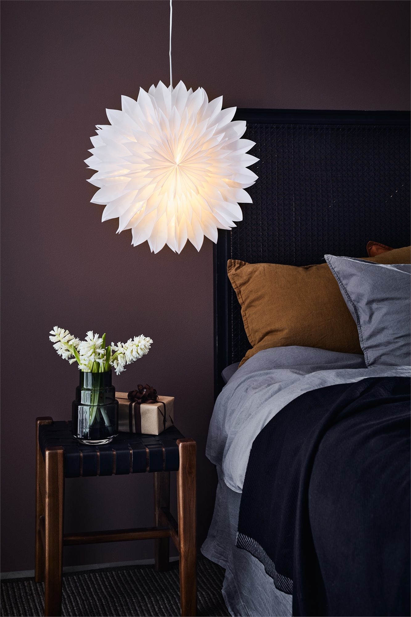 Красивая круглая пуансеттия серого цвета. Диаметр звезды составляет 45 см. Для светильника требуется лампочка с маленьким цоколем (E14) мощностью не более 6 Вт, в комплект не входит. Белый кабель длиной 3,5 м с выключателем. Размер лампы: 48 см в ширину, 14 см в глубину, 48 см в высоту.