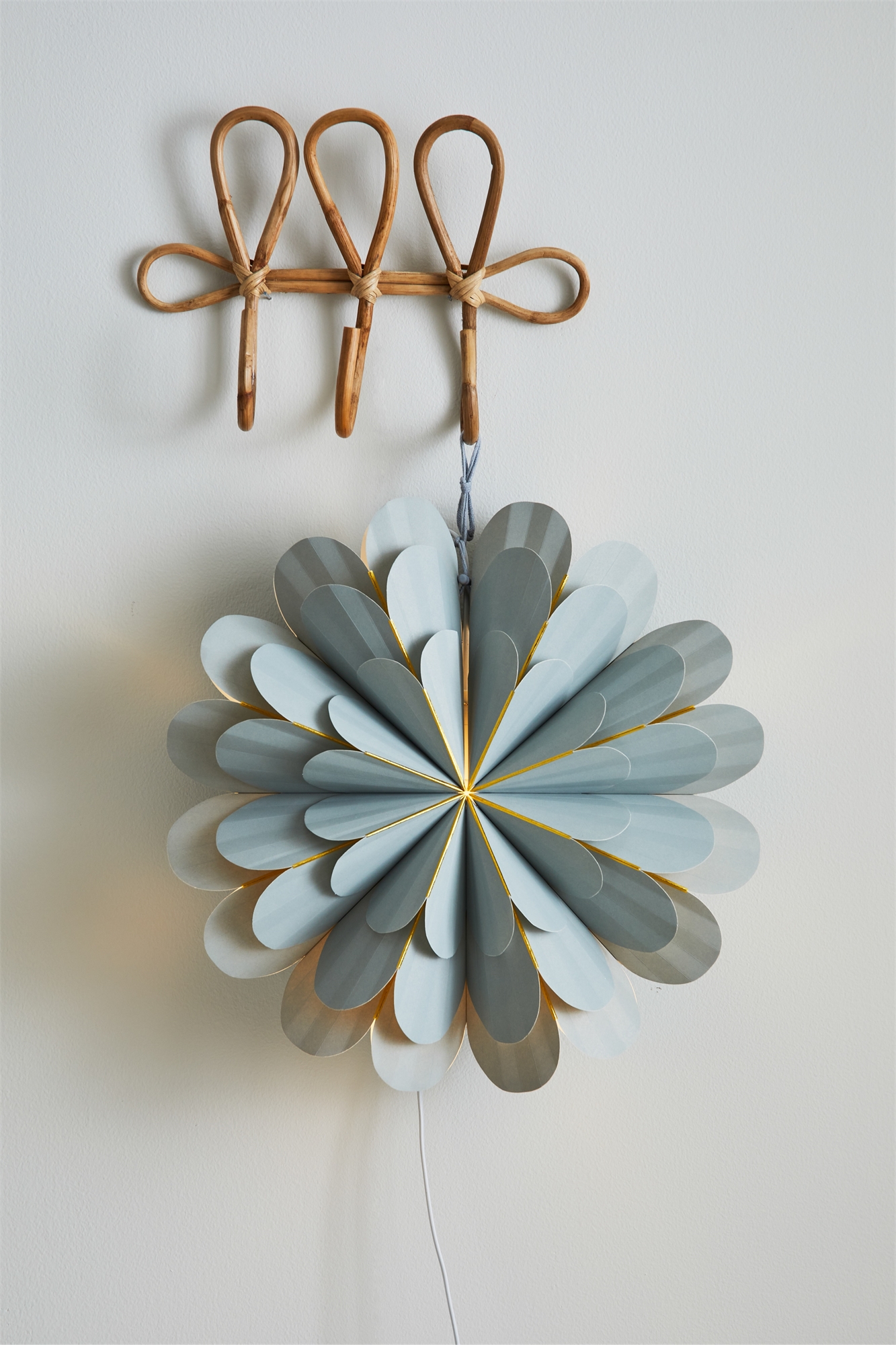 Розовый оконный светильник с бумажным абажуром в форме цветка. Плиссированная бумага дает красивое свечение. Для лампы требуется лампочка с маленьким цоколем (E14) мощностью не более 25 Вт или эквивалентная светодиодная лампа, в комплект не входит. Белый кабель длиной 3,5 м с выключателем. Размер лампы: 45 см в ширину, 19 см в глубину, 45 см в высоту.