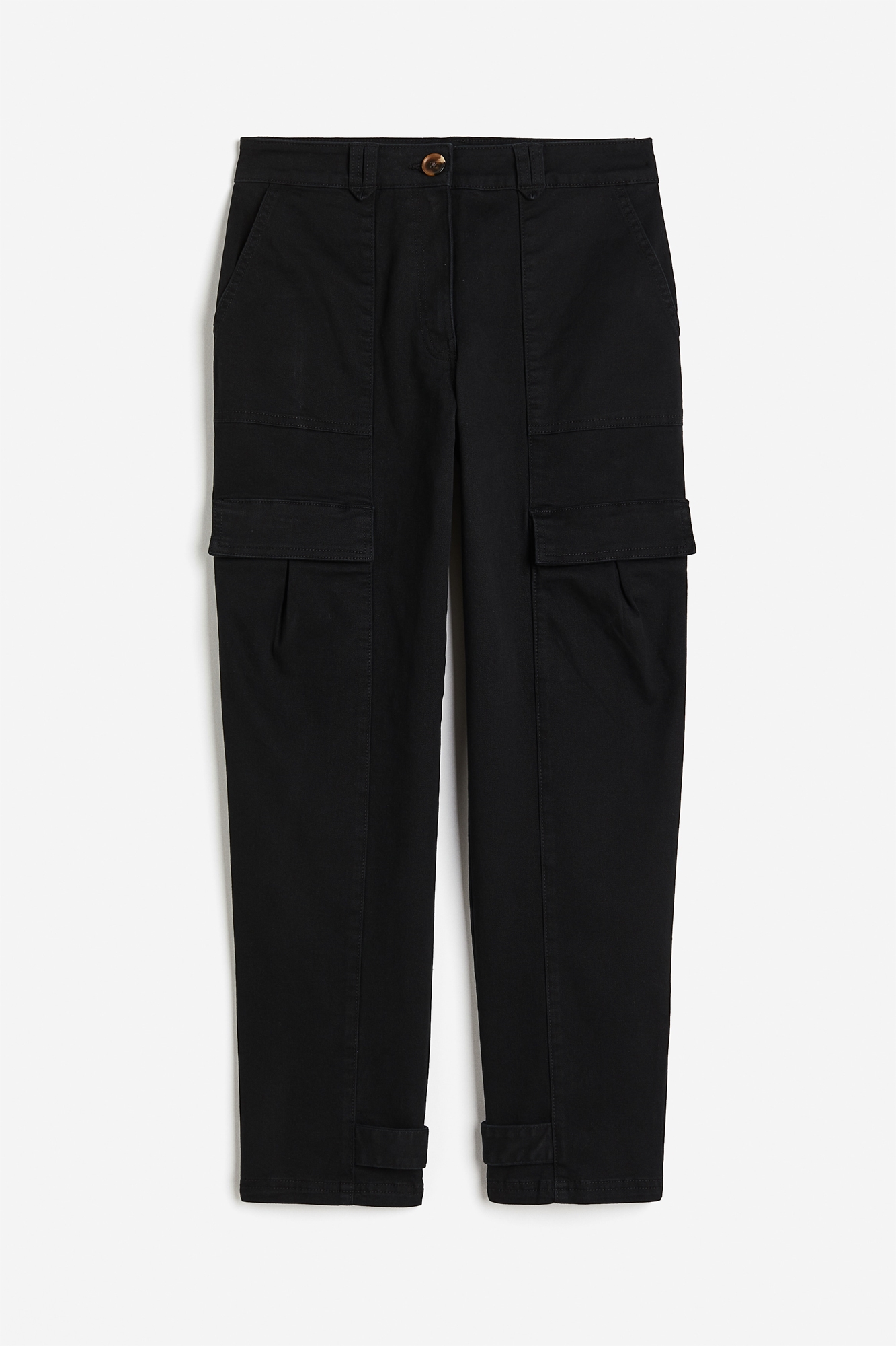Брюки длиной до щиколотки из хлопковой саржи с высокой талией и ширинкой на молнии с пуговицей. Диагональные передние карманы, прорезные задние карманы и карман с клапаном на каждой штанине. Зауженные штанины с регулируемой планкой на подоле.