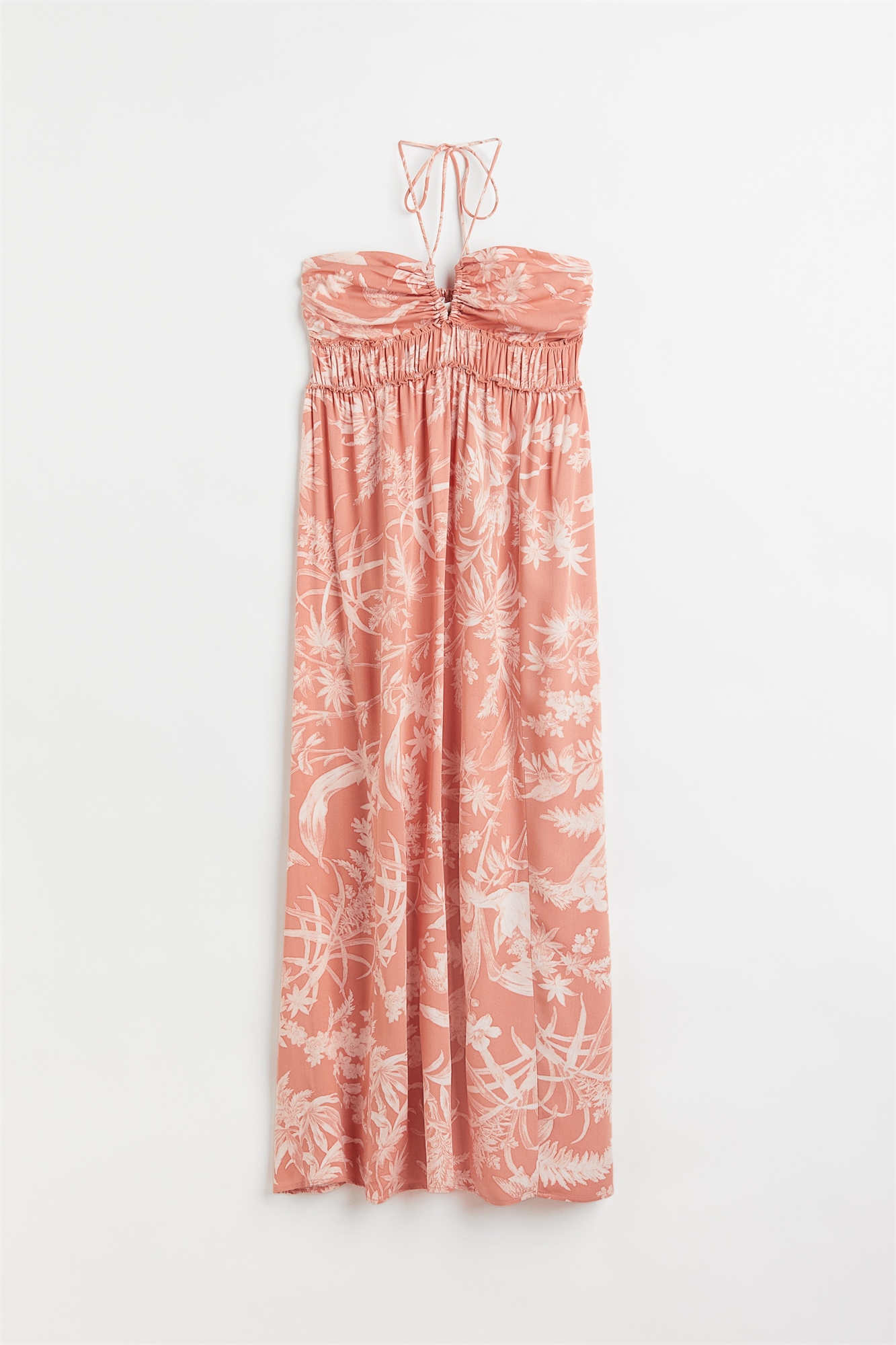 Платье без рукавов длиной до середины голени из вискозного полотна с небольшой проймой в верхней части и узкими завязками, застегивающимися сзади на шее. Два эластичных шва под бюстом спереди и платочная вязка сзади. Двойной слой в верхней части и мягко расклешенная плиссированная юбка. Без подкладки.