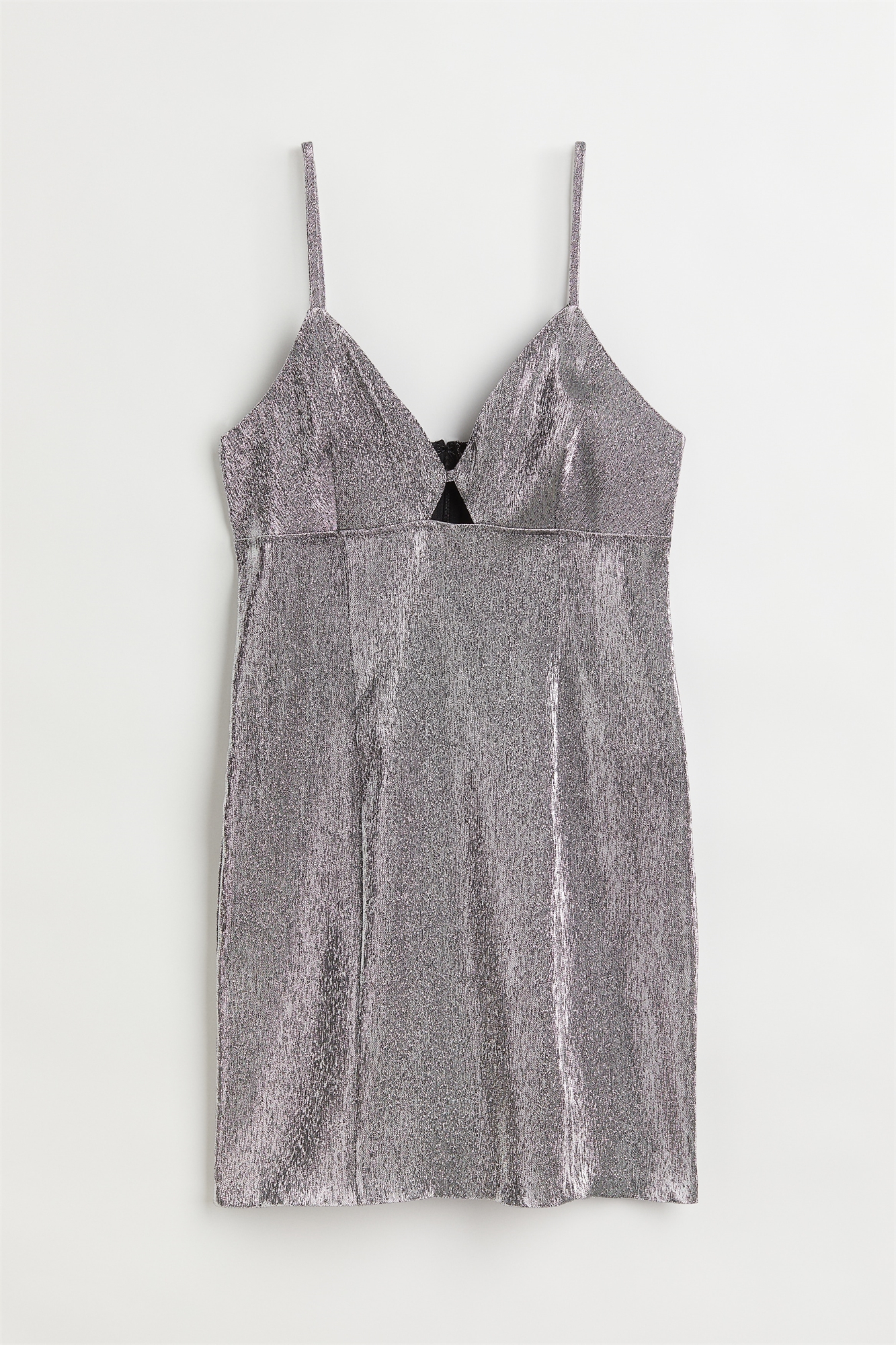 Короткое приталенное платье без рукавов из тканого материала с узкими регулируемыми бретелями и V-образным вырезом с разрезом спереди. Шов под бюстом и незаметная застежка-молния сзади. Без подкладки.