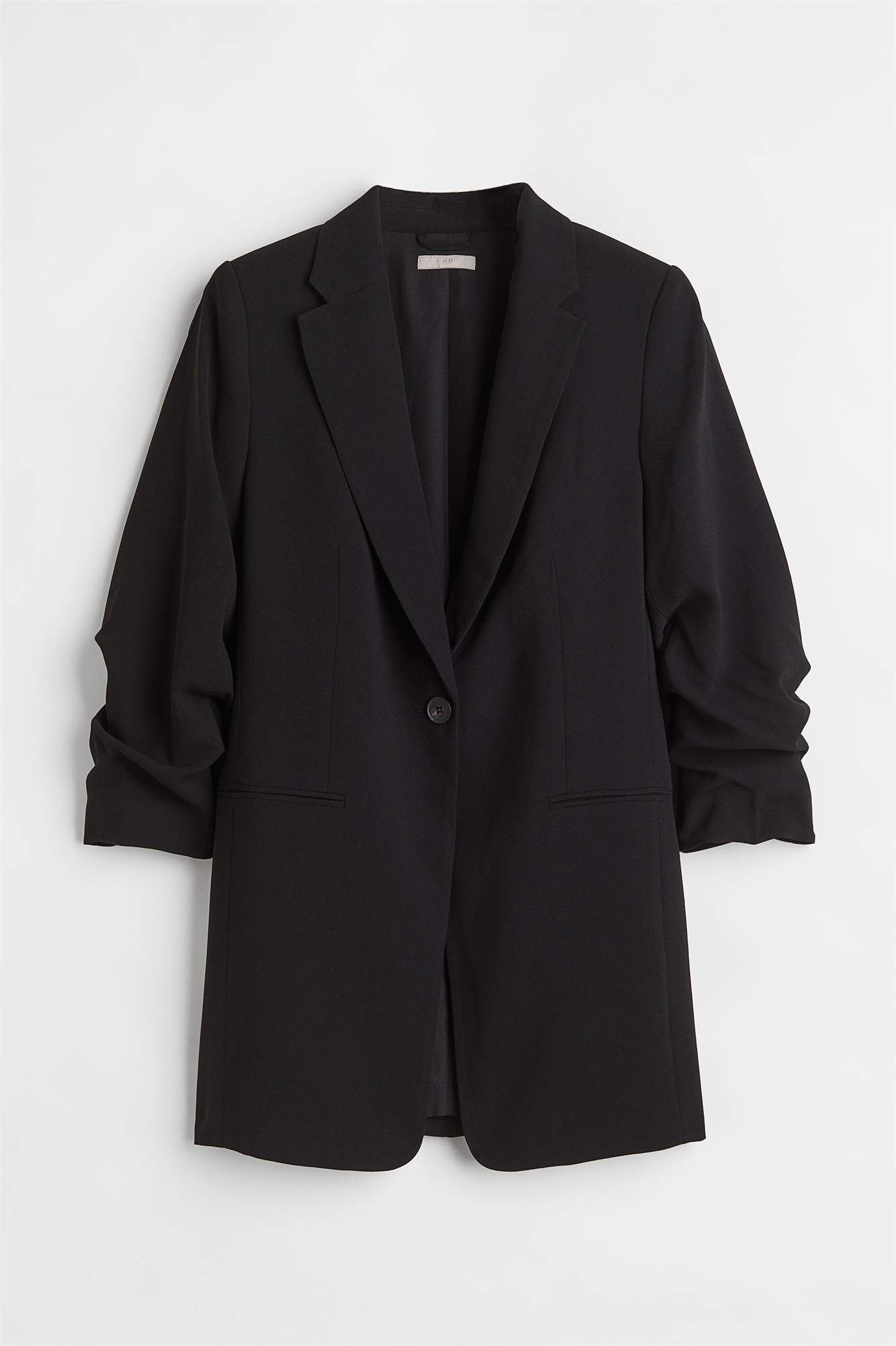 Жакет прямого покроя из тканого материала. Свободный крой с узкими лацканами с вырезами, застежка на одну пуговицу спереди, втачные передние карманы и сборчатые рукава длиной 3/4. На подкладке.