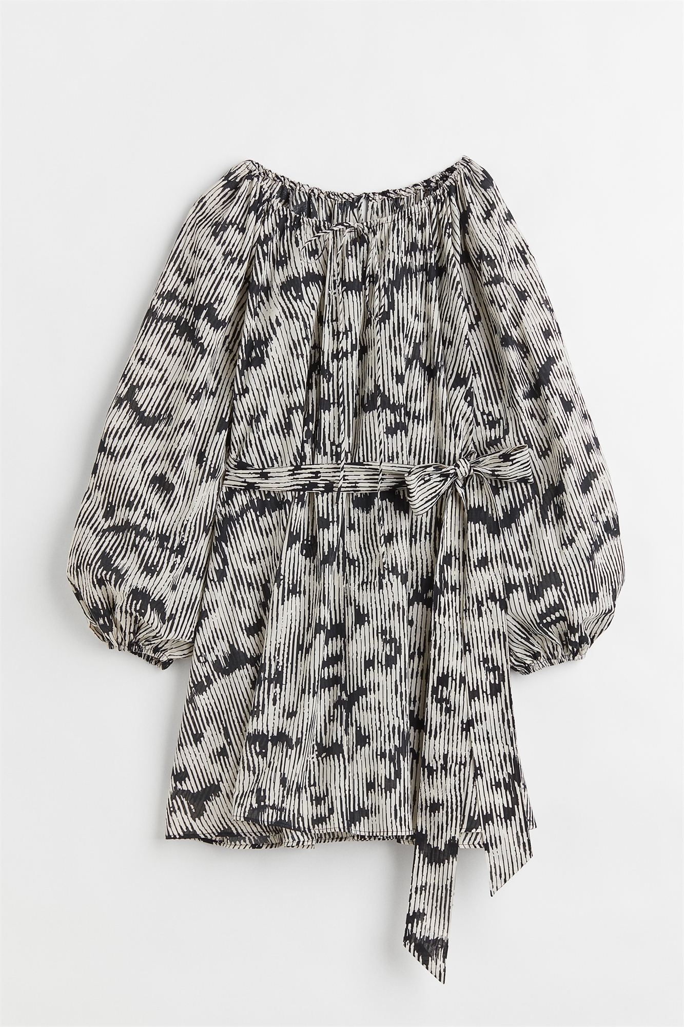 Короткое платье из хлопкового полотна. Широкий вырез с завязкой и V-образной проймой спереди и сзади. Объемные рукава-баллоны реглан с узкой резинкой на манжетах. Длинный пояс-завязка на талии, который можно обернуть вокруг тела несколько раз. Без подкладки.