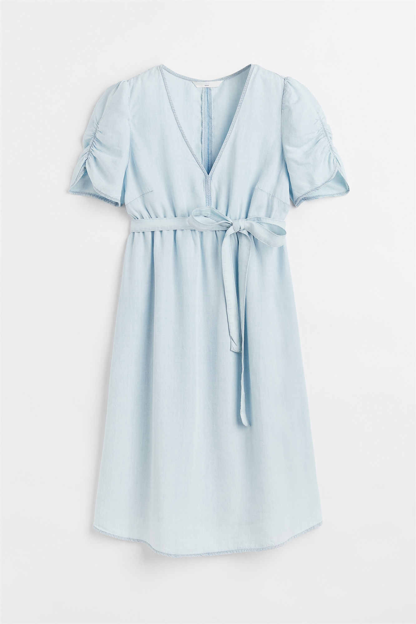 Короткое платье из лиоцелловой ткани джинсового цвета. Платье имеет V-образный вырез, короткие рукава со сборками, эластичные продольные швы и эластичный шов и завязывающийся пояс на талии. Без отделки.